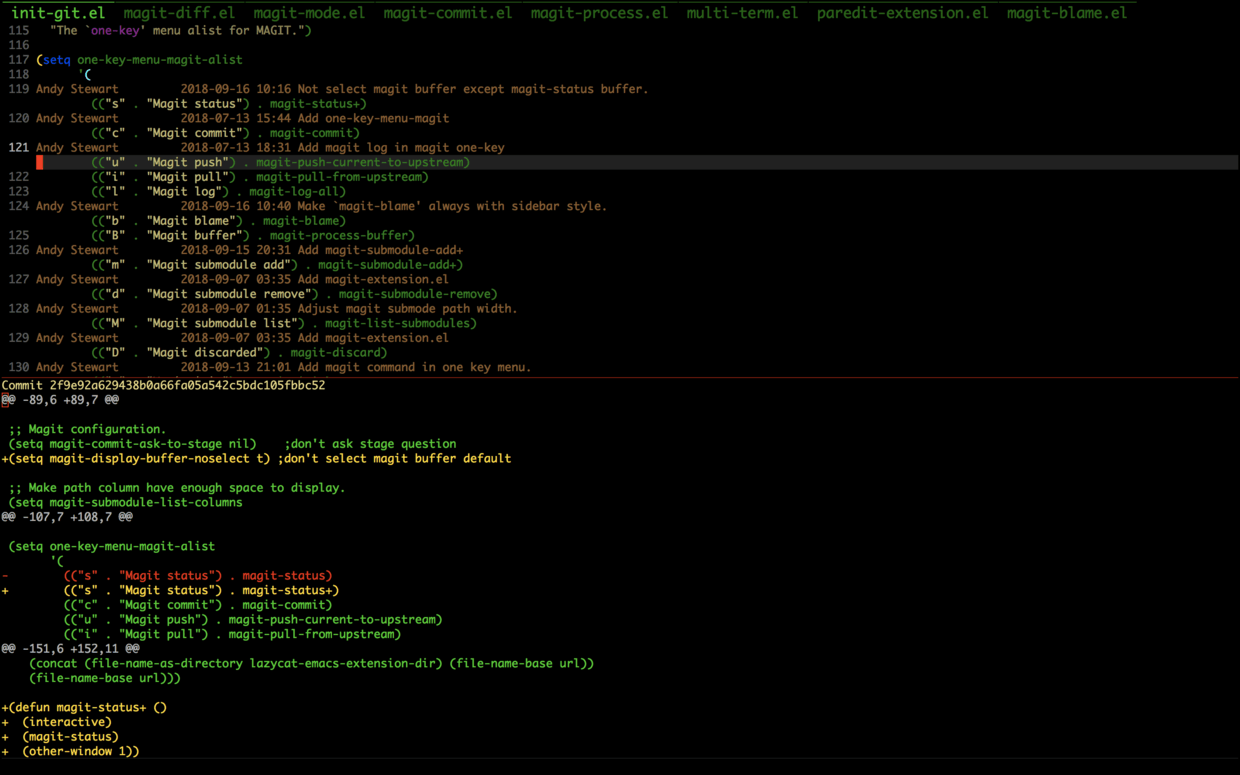 就像下图一样, 我们可以在当前行相关的所有 commit 的 diff 中穿梭, 研究当前行相关的修改历史.