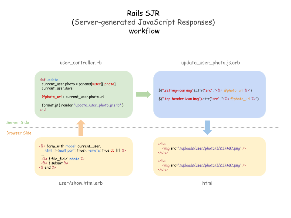举个简单的例子, 如果我们要实现上图中这种上传头像后自动更新页面中两处头像元素的功能, 我们一般会按照下图这种 Rails SJR (Server-generated JavaScript Responses) 流程来处理: