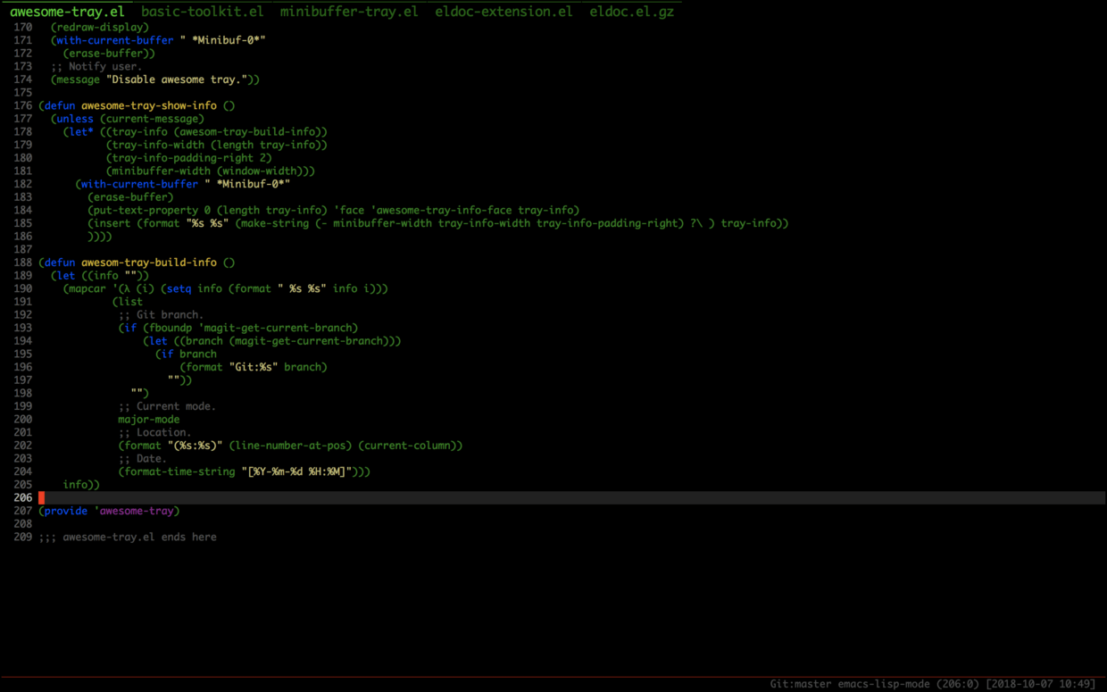 - 下载 AwesomeTray 里面的 awesome-tray.el 放到 ~/elisp 目录