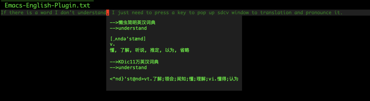 我们阅读英文材料的时候, 难免会看到不认识的单词, 所以我十多年前给Emacs写了一个星际译王的插件 sdcv.el , 按一个快捷键就可以翻译当前的英文单词, 或者把输入的中文翻译成英文单词.