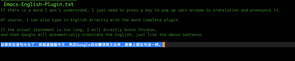 平常我都是在浏览器开一个Google翻译,写一段中文, 拷贝翻译到Emacs再调整, 在浏览器和Emacs中间来回折腾, 效率低到我这种键盘党无法忍受.