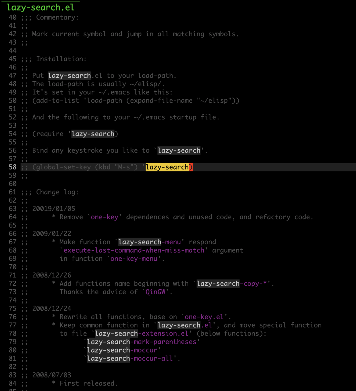 2008年的时候, 写了插件 lazy-search.el, 主要的目的是, 自动激活当前光标处的符号, 然后直接按 s 或者 r 就可以在匹配的字符中快速跳转, 跳转到目标位置后按q退出搜索继续编程