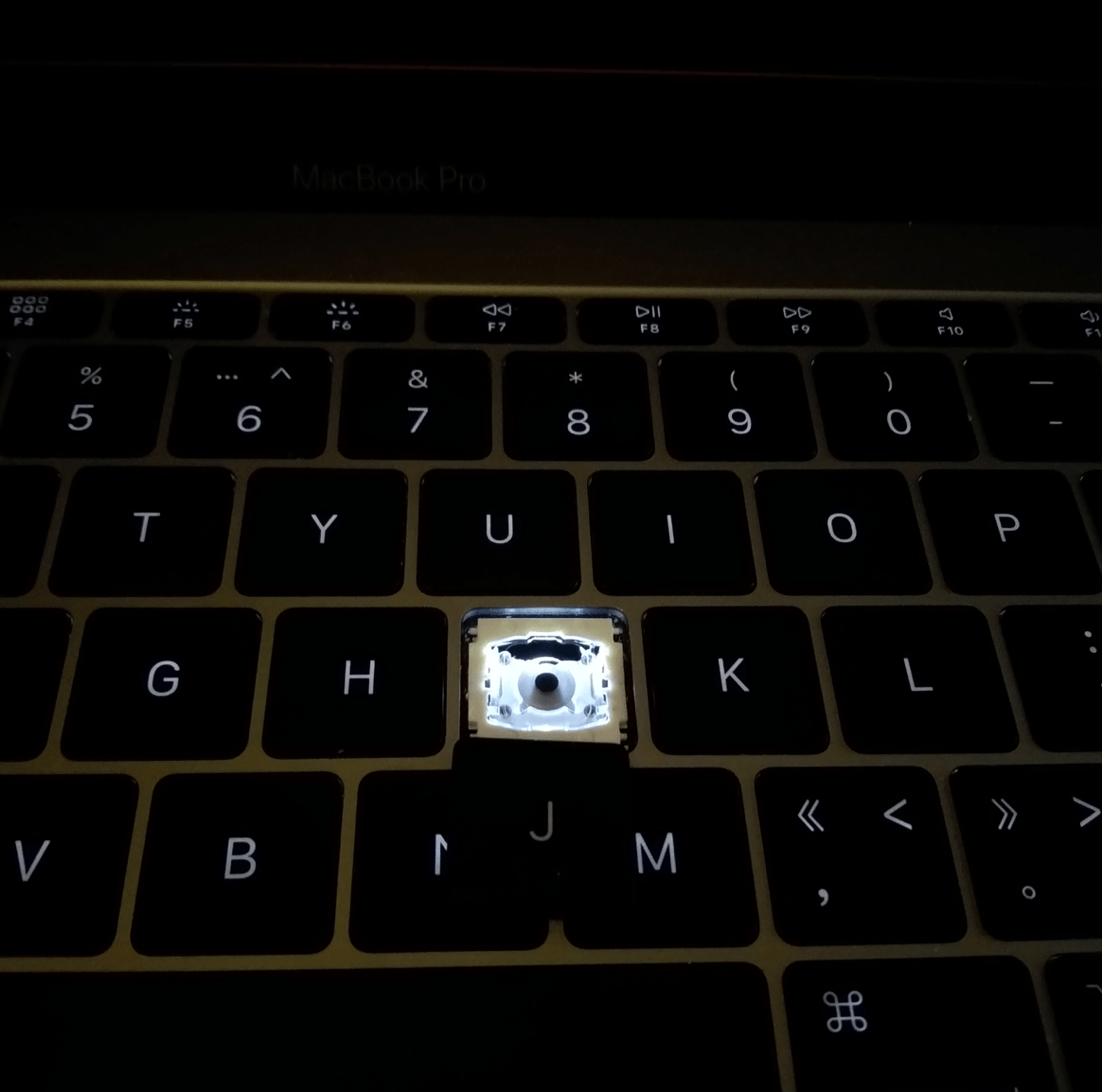 人算不如天算啊,MacBook Pro用了刚好一年,J这个按键已经被我敲碎了,完全没法用了: