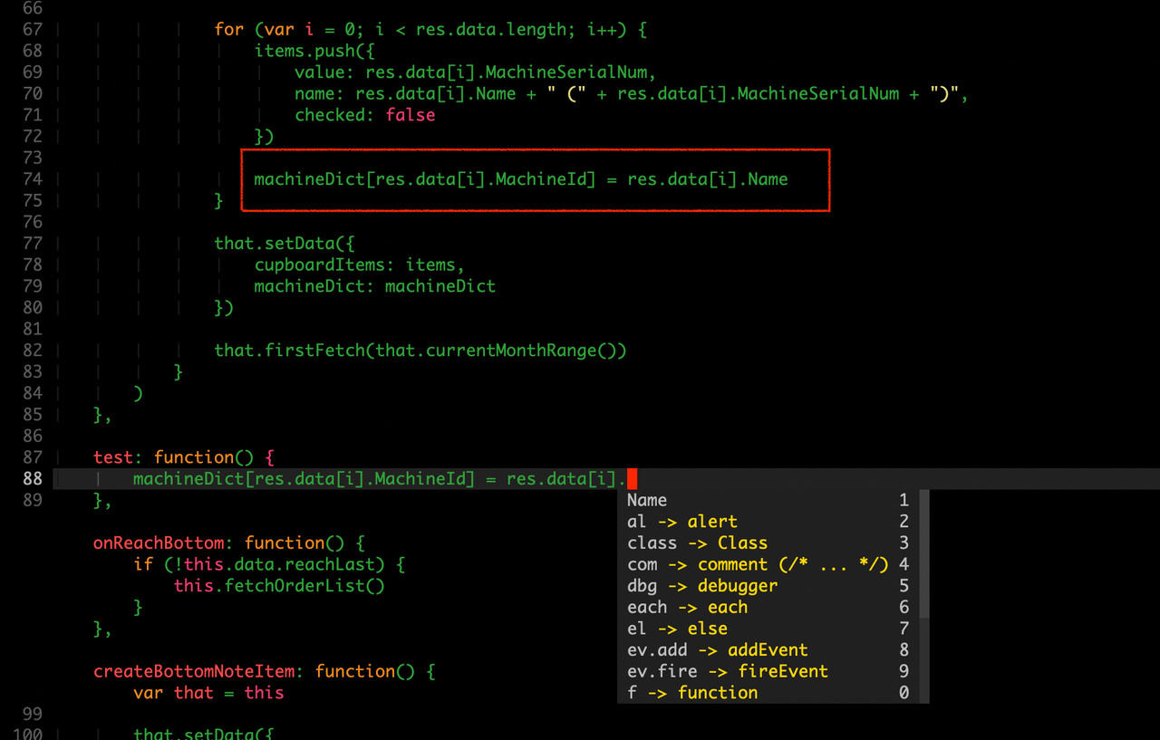 所以当我在另外一个函数中写下 machineDict[res.data[i].MachineId] = res.data[i] 然后敲击 . 的时候,TabNine 通过算法分析出,我很有可能是想写 res.data[i].Name , 那也正是我想要的。