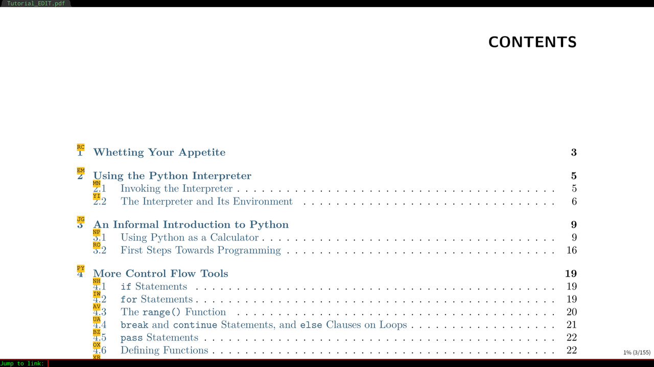 这个功能的用法很简单,当你在EAF PDF Viewer里面按 f 键后,EAF会自动在PDF所有可以跳转的地方,画上类似 Vimium 的按键线索: