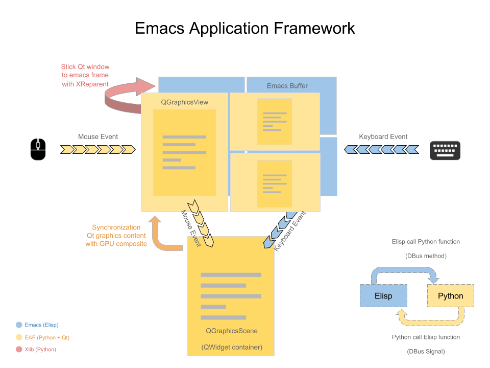 EAF的输入事件的原理主要是在Emacs截获键盘事件,然后通过DBus传递事件字符串给Python进程,Python端再在Qt中根据事件字符串伪造Qt键盘事件发送给EAF应用。