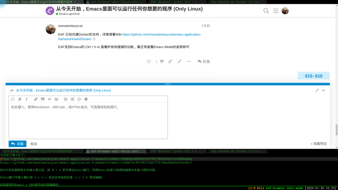 - 先在EAF浏览器输入框获得键盘焦点,按 Alt + e弹出Emacs编辑窗口,利用Emacs来高效编辑文本输入框的内容;