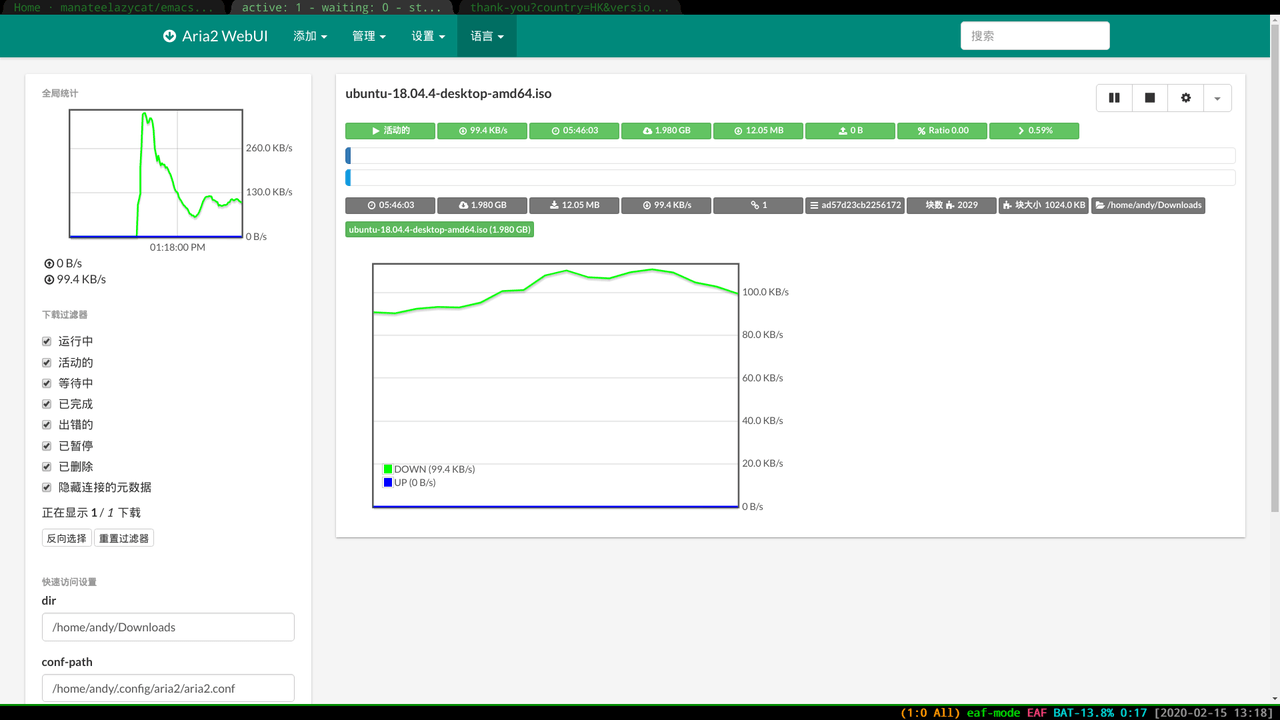 并且在EAF浏览器中按 i 键,可以直接打开Aria2的网页客户端,用来管理文件的下载,暂停,删除并查看下载速度等详细信息: