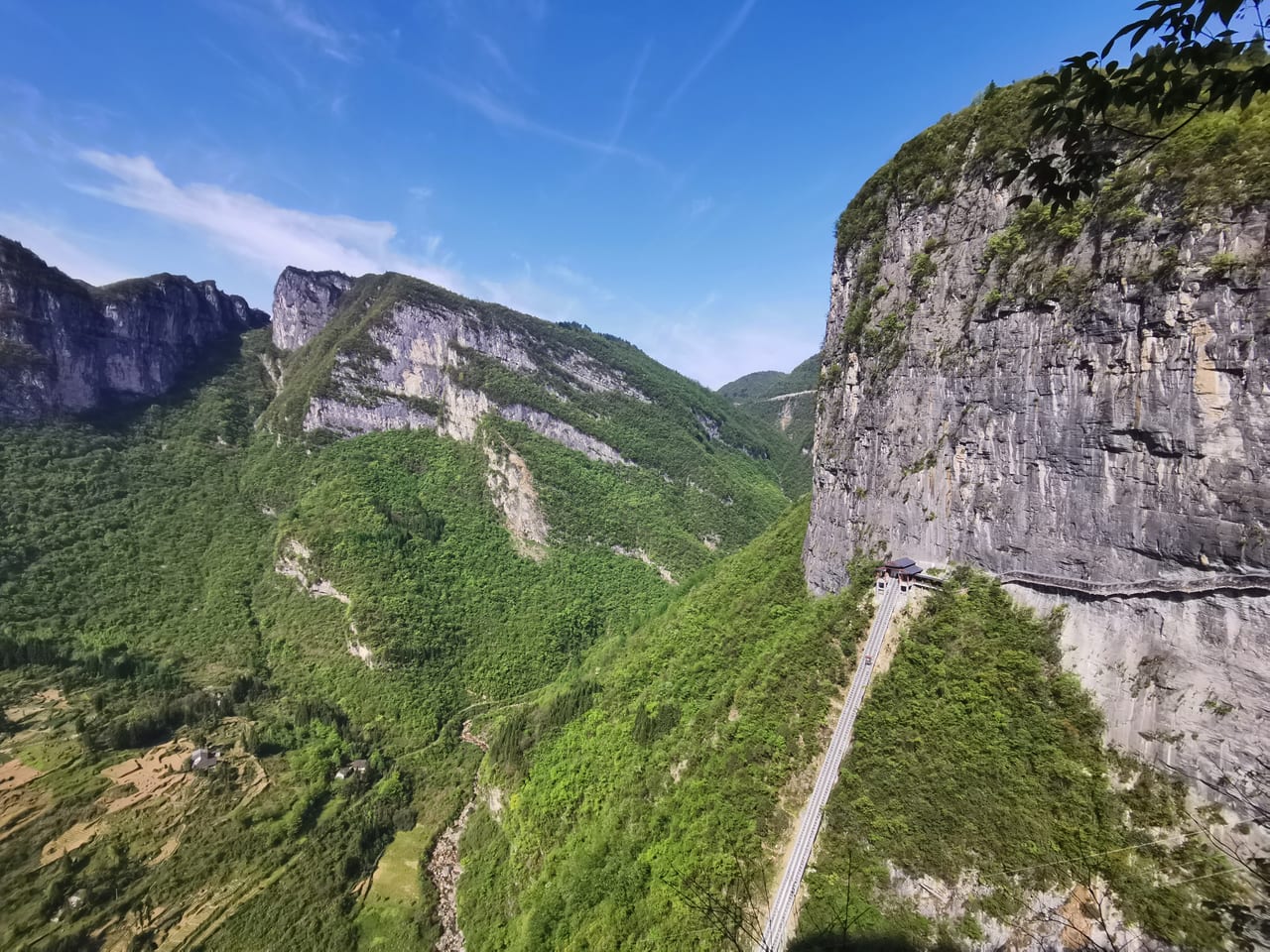 这次去景区的回程电梯还在试运营阶段, 我们当了一次小白鼠乘坐敞篷电梯(没有门)上山, 电梯在 200 多米的高空中途停电, 大风呼呼的往电梯里灌还是蛮惊悚的, 建议大家过段时间电梯调试好了再前往。