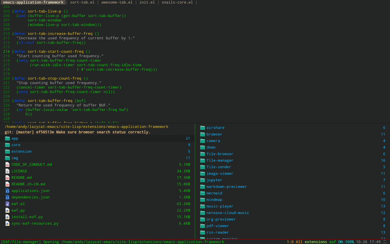 - 顶栏设计,抛弃了header-line和tab-line的设计, 所有窗口都共享一个标签栏,最大程度减少纵向空间的浪费,再配合Awesome-Tray,整体上可以实现非常简洁的视觉感官。
