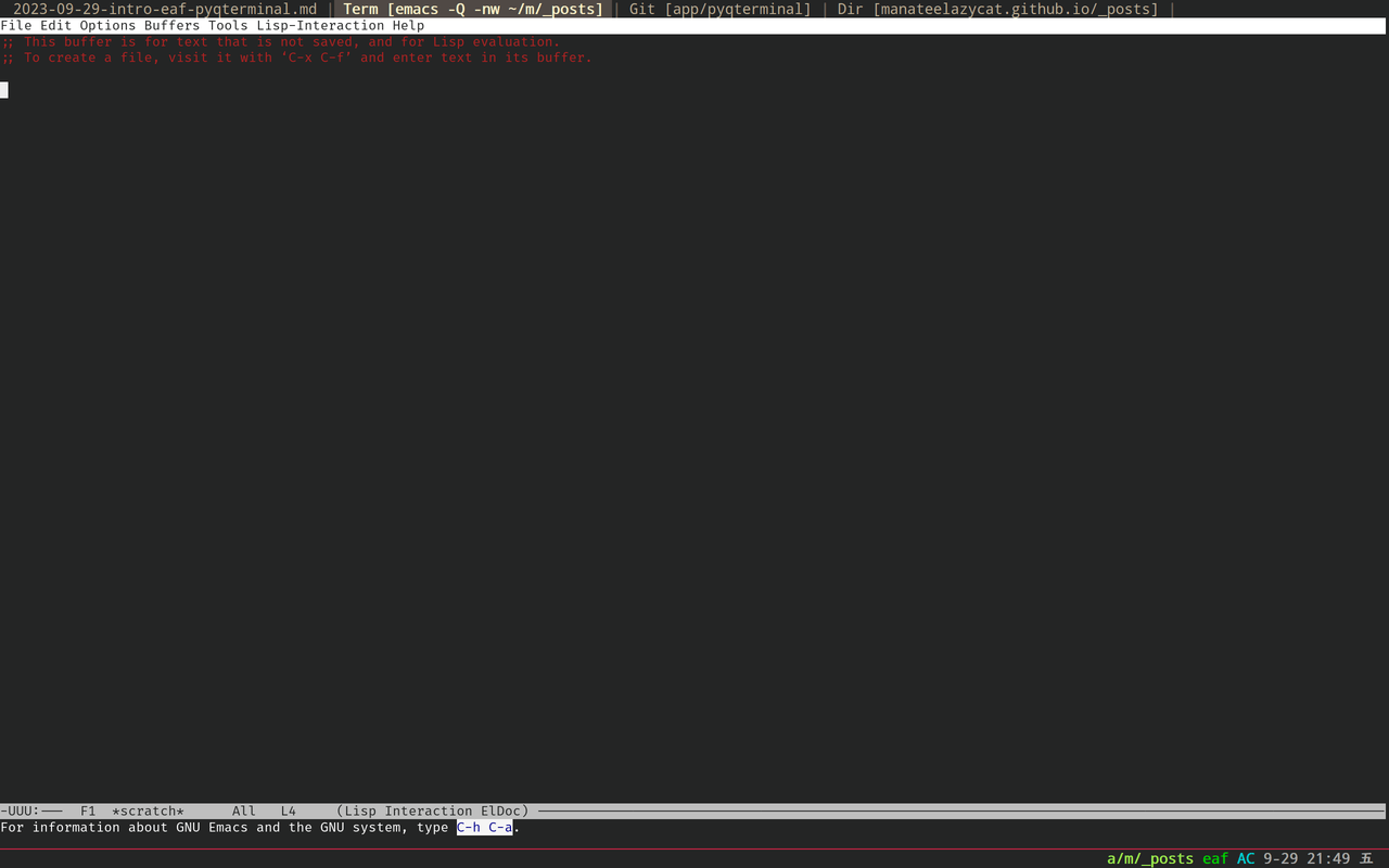 终端方面我主要用社区开发的 eaf-pyqterminal, EAF PyQTerminal 也许是 Emacs 下最好的终端模拟器, 理由如下: