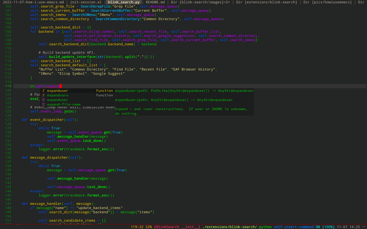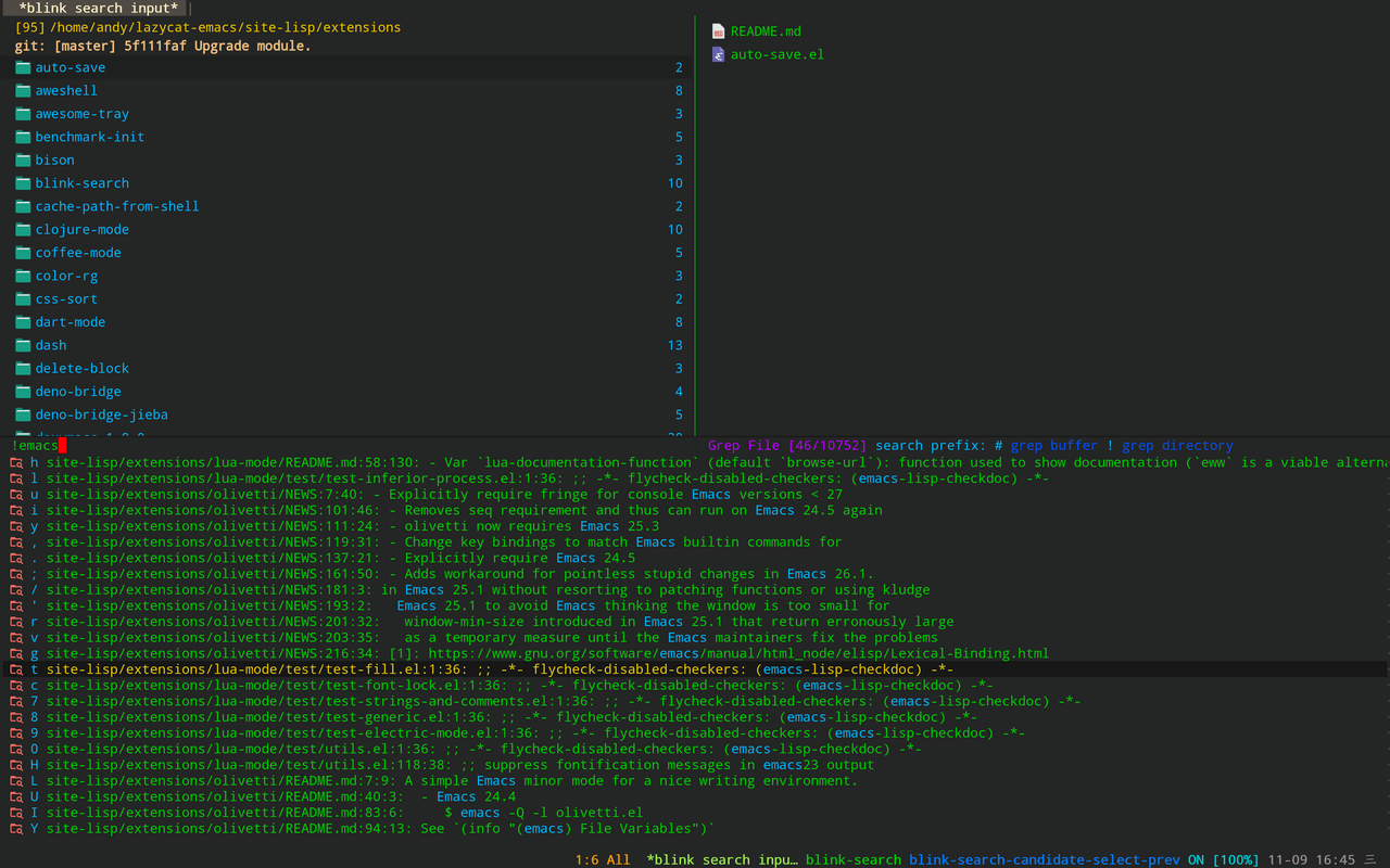 搜索插件是我使用频率最高的插件, 以前开发过 anything、 helm、 snails 的插件, 主要不满意的地方是搜索数据多的时候会卡一下。 最近基于 Python 多线程技术开发了 blink-search, 保证不管多大的搜索数据, Emacs 永远都绘制屏幕可视区域的内容。