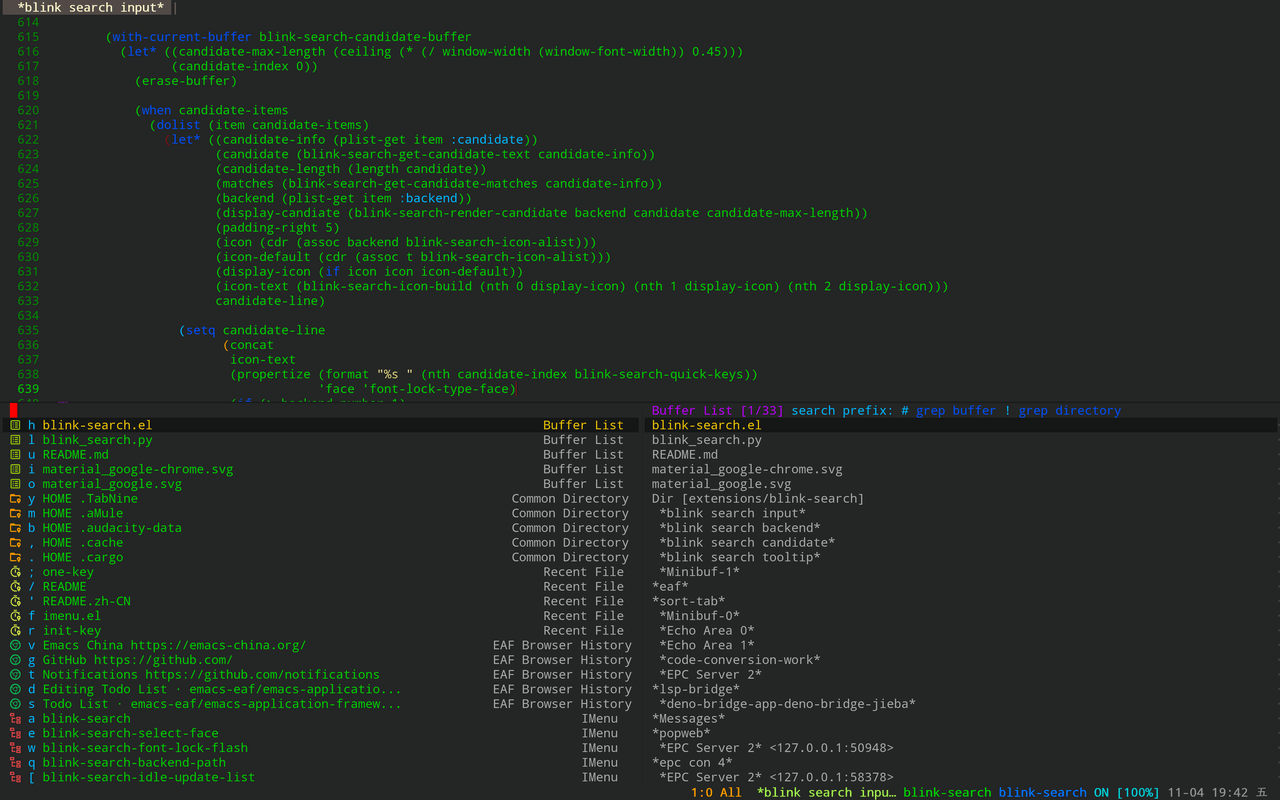 因为 blink-search 小心的进行多线程设计和渲染优化, 基本上不管以后加多少个搜索后端, 都会非常快速的响应, blink-search 更适合那些习惯 helm 的用户切换, 探索性搜索体验还离 ivy 有不少差距。