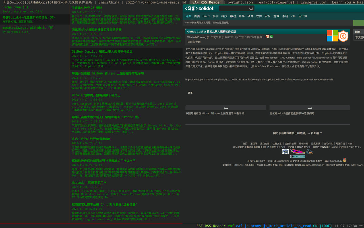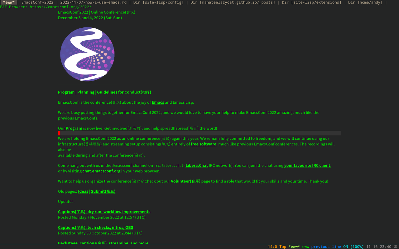 这种操作和直接用 eww 打开网页的区别是, EAF Browser 先用 Readability.js 提取网页中真正需要阅读的内容(过滤掉网页两边的控件和导航链接等)再传递给 eww, 这样既可以避免 eww 的缺陷 (无法解析 CSS 和 JS), 又能利用 eww 文本渲染的能力为我所用。