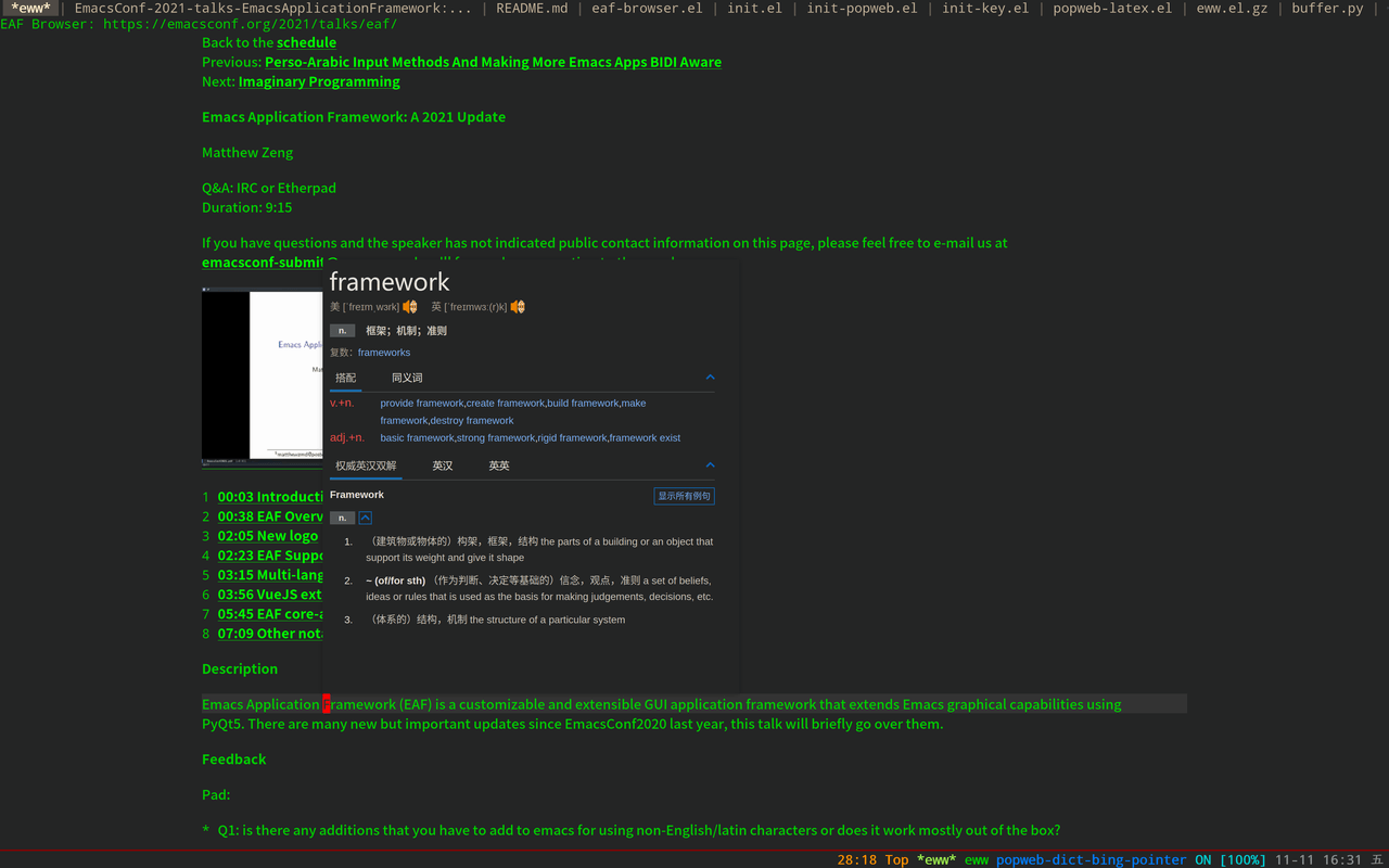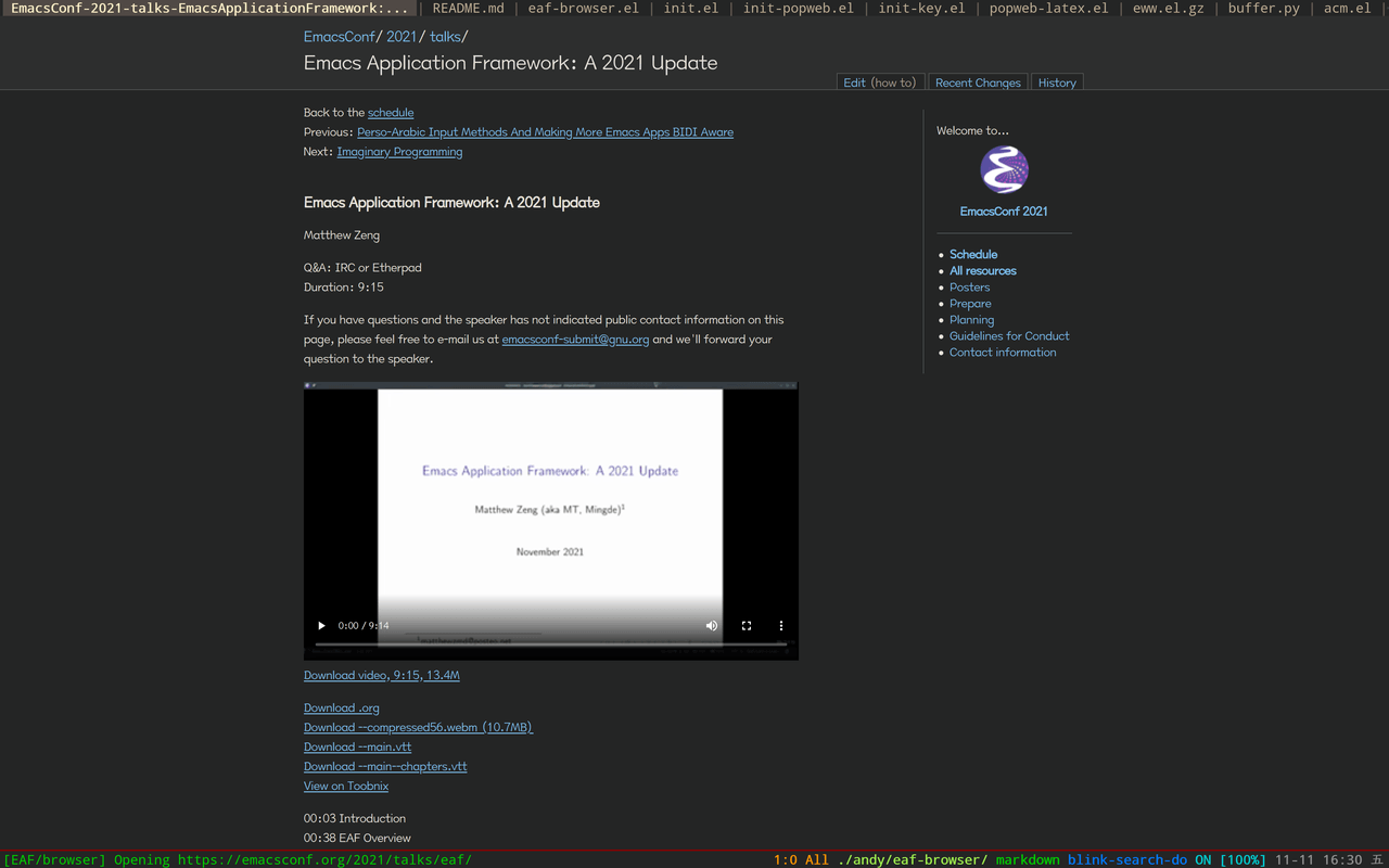 EAF 浏览器基本上就是 EAF 这个项目最重要的应用, 内置 V8 的 JavaScript 引擎就不用多说, 包括 DarkerReader、 Vimium、 EditInEmacs、 ReaderMode 等日常通用的快捷键功能都非常齐备。