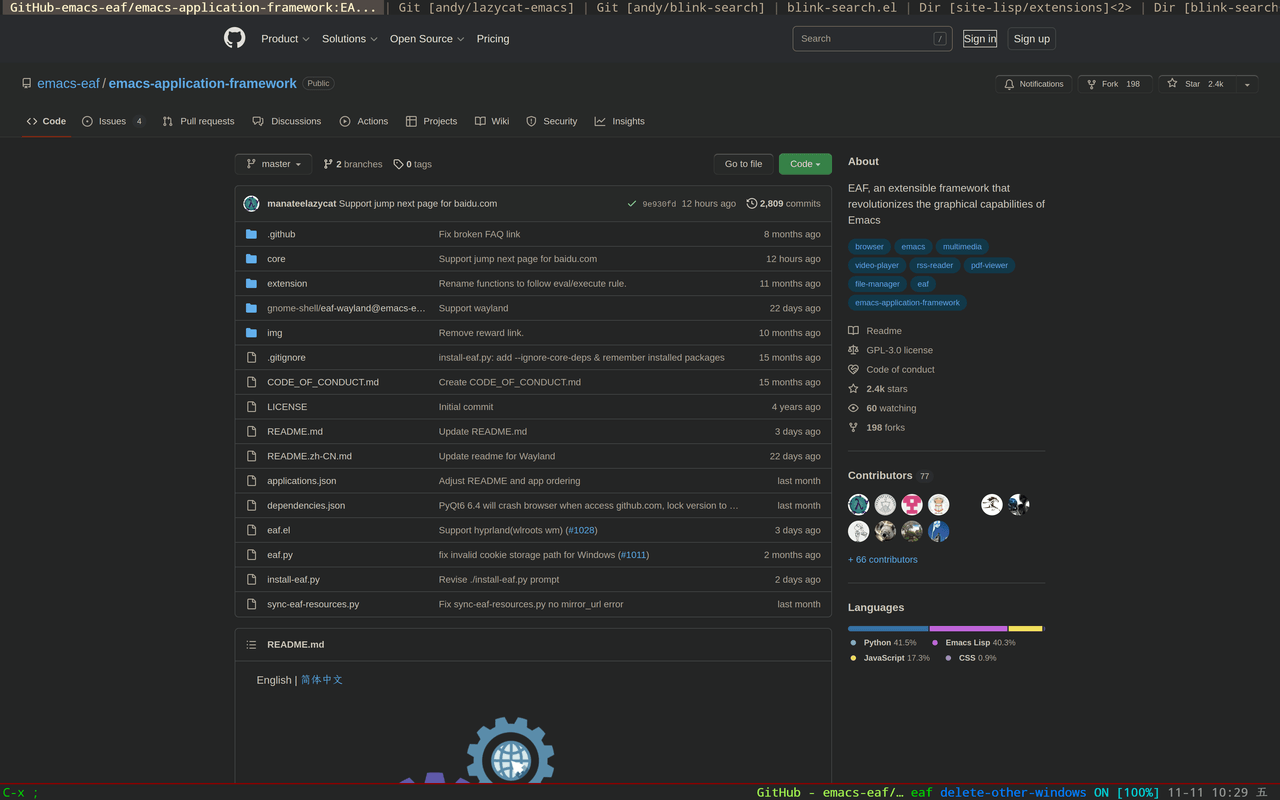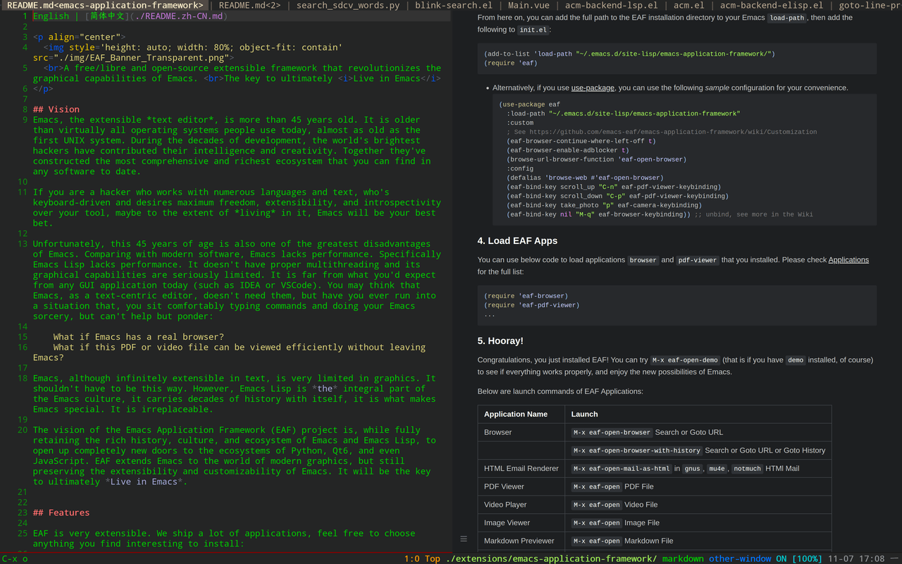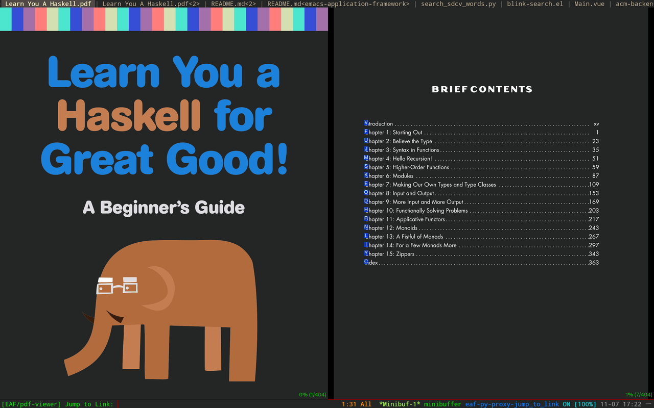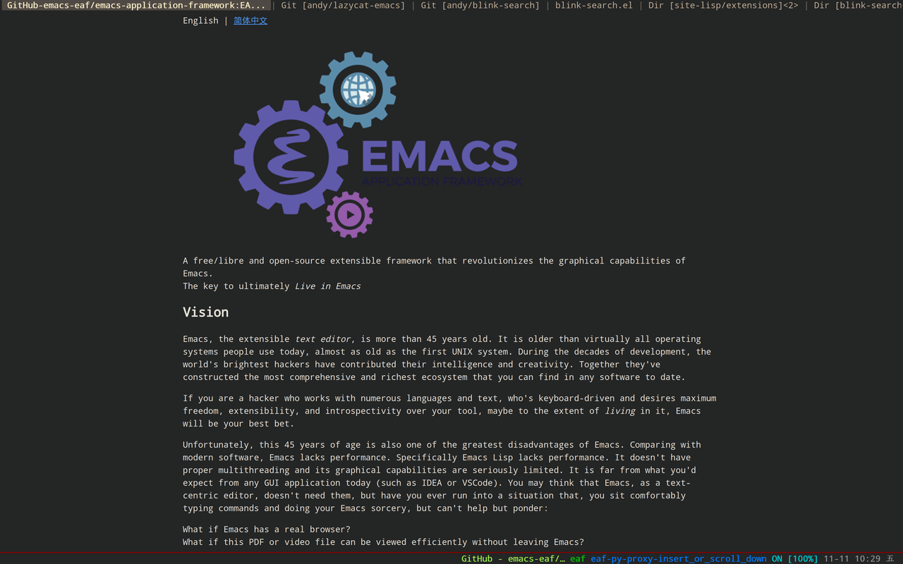 日常文件管理和学 习娱乐基本上是 EAF, 我用 EAF 替换大部分 Emacs 对应插件的理由主要是某些模块 Emacs 无法实现或者 Emacs 无法做到像素级别对齐和美观的图形界面。