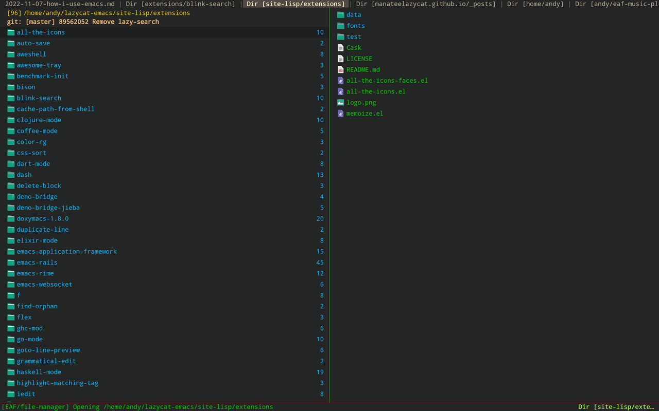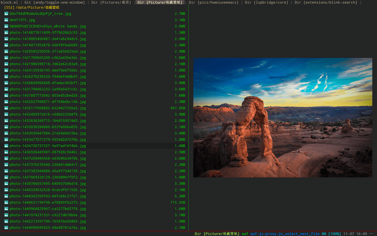- 中间是 EAF 的文件管理器应用, EAF 文件管理器相对于传统的 dired 主要的好处是, 双栏设计, 非常方便快速预览文件和图片, 内置多线程技术, 不会因为文件数量多而导致的卡顿。 同时, 文件的信息都是按照结构体的方式进行存储计算, 扩展新功能的时候, 不用担心像 dired 那样基于文本正则表达式的方式各种魔改, 也不会发生 dired 各种高级插件之间的相互冲突。 最后, 像大家常用的快速标记文件、 递归查找文件、 整个目录转换成文本后批量编辑的功能, EAF File Manager 都已经完整实现。