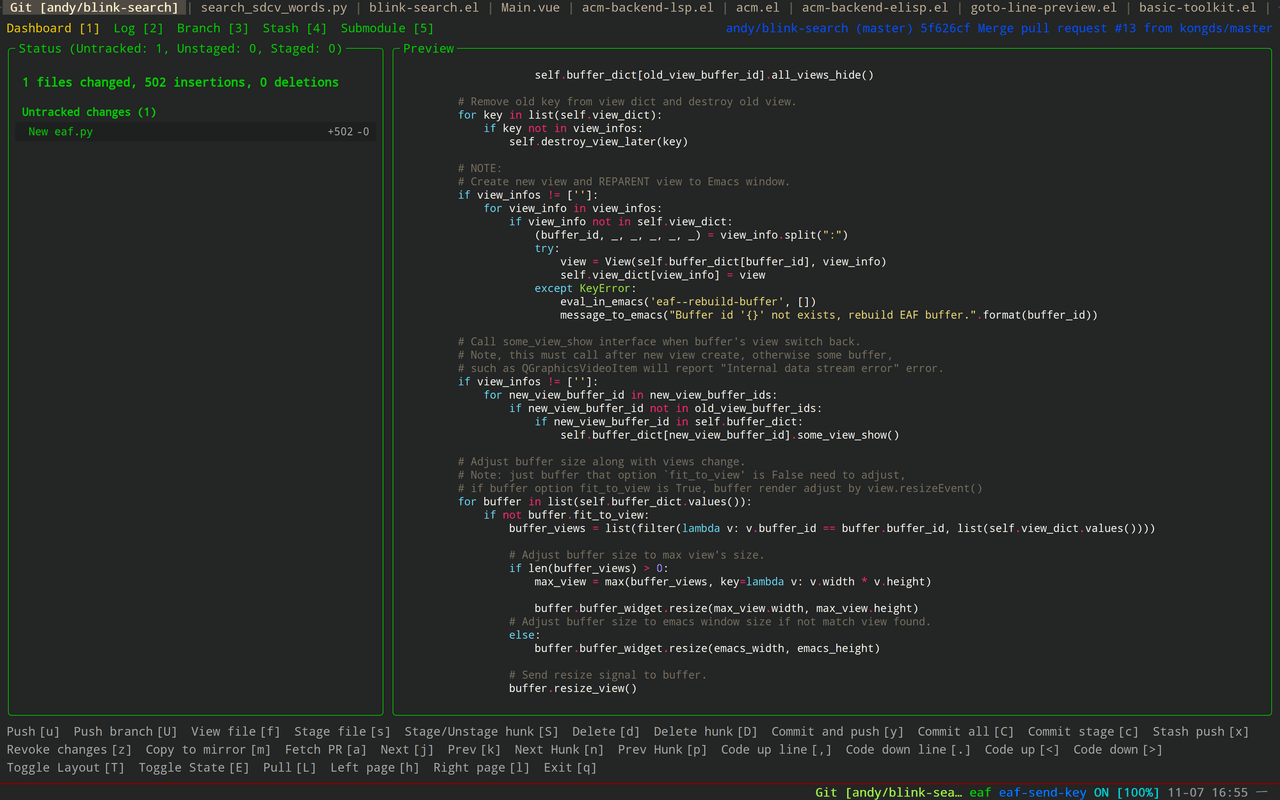 EAF Git 从功能上, 现阶段肯定要比 magit 弱很多。 EAF Git 的局部优势是, 多线程技术加持不会有性能问题, 比如 Linux Kernel 上百万的 Commit 可以全部展开和实时搜索, 这种规模的项目, magit 打开就直接卡死了。 同时 EAF Git 的界面和设计都是面向 Git 小白来设计的, 全是傻瓜化操作, 相对于 magit 更好入门一点。