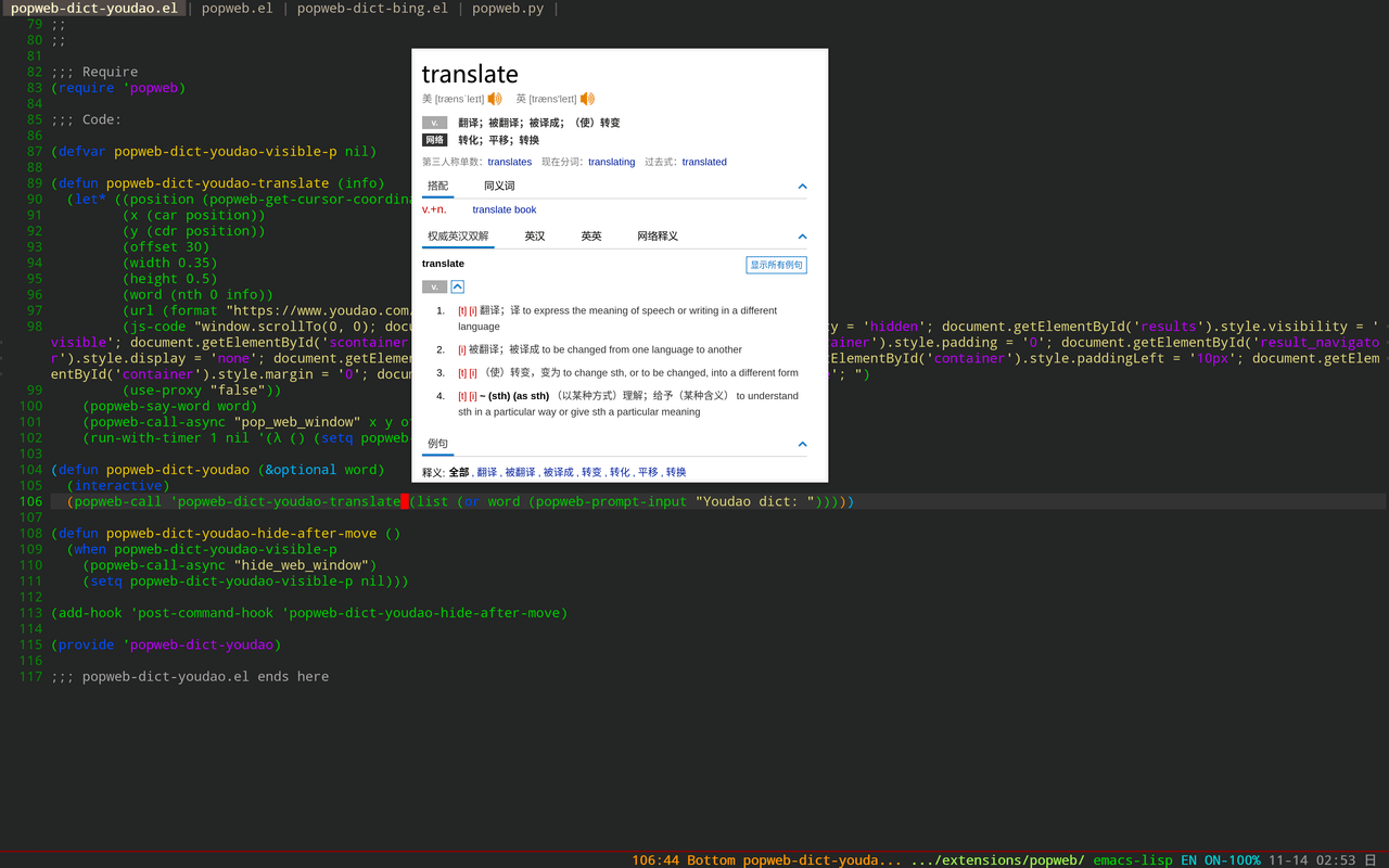 除了英文辅助写入, 偶尔查一下单词也是必须的, 以前都用 sdcv, 我一直嫌弃排版不好看, 后面基于 EAF 的原理写了 popweb, popweb 利用网页技术来展示在线翻译页面, popweb 很难被封锁的原因是, 它本质是打开翻译网站的网页, 然后利用 CSS 隐藏掉不需要的页面元素, 这种实现方式非常简单稳定, 不需要破解 API, 维护代价很低。