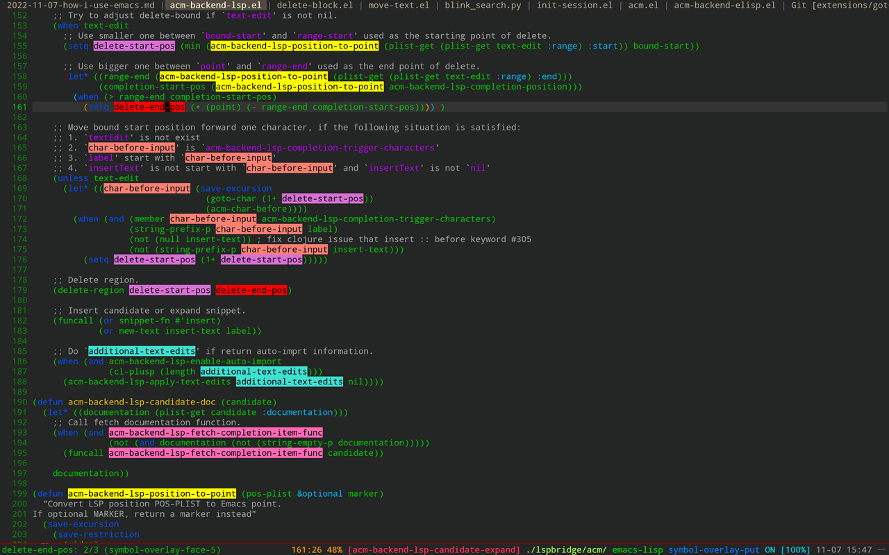 代码语义编辑方面, 我主要用 lsp-bridge, lsp-bridge 的好处是利用 Python 多线程的技术, 结合专门为 LSP 协议开发的 acm 补全菜单, 能够把 Emacs 代码语法补全性能提升到 VSCode 的水平。