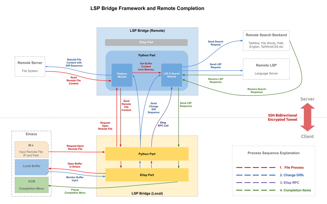 下面是 lsp-bridge 远程代码补全技术的架构图: