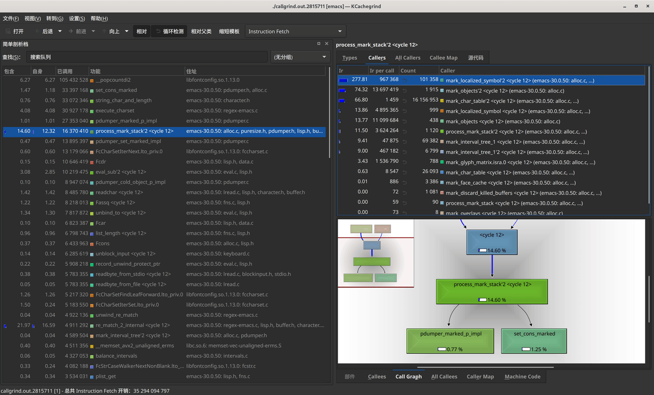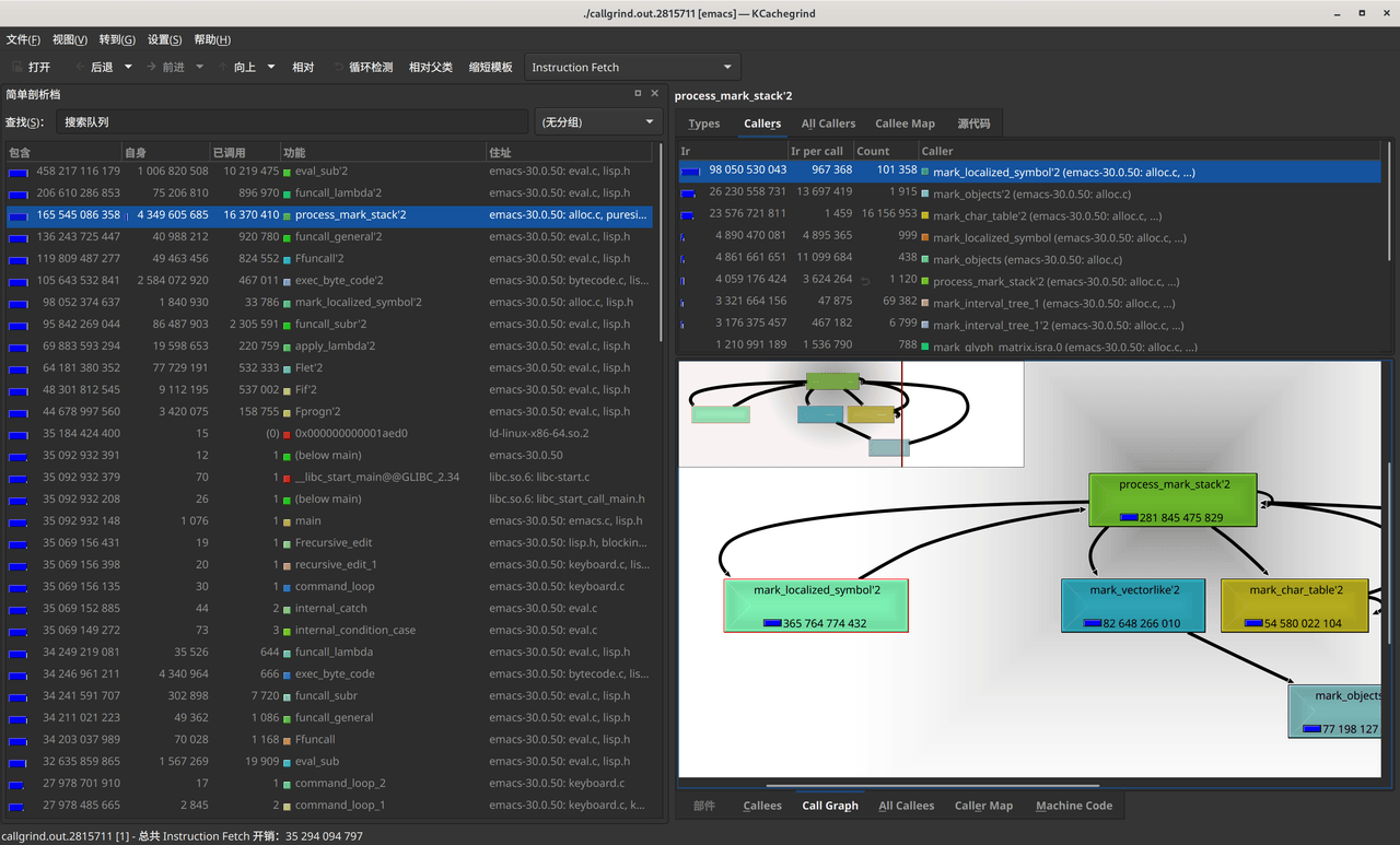 等待 valgrind 启动完(需要十几秒), 运行 Emacs 卡顿的命令, Ctrl + C 结束分析
