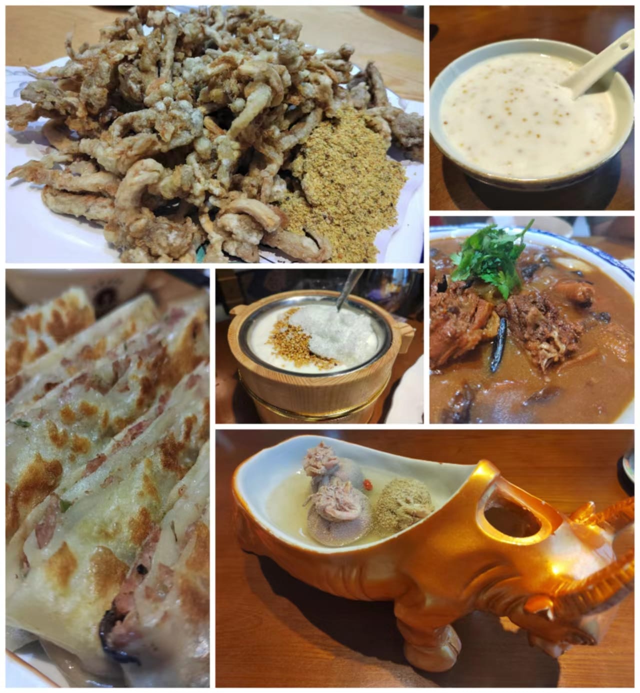 中午顺道吃一下当地的美食: 炸蘑菇、 小鸡炖粉条、 手扒肉配韭菜花、 蒙古酸奶, 推荐老家千层肉饼总店和娜仁塔蒙这两个餐厅。
