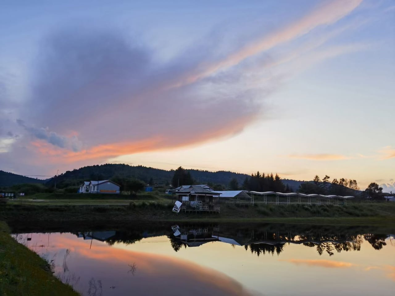 晚上可以直接住在景区门口的一家酒店, 价格和伊春市区的酒店差不多, 但是环境却要好很多, 吃完晚饭在酒店门口看看晚霞遛遛弯, 也是非常惬意。