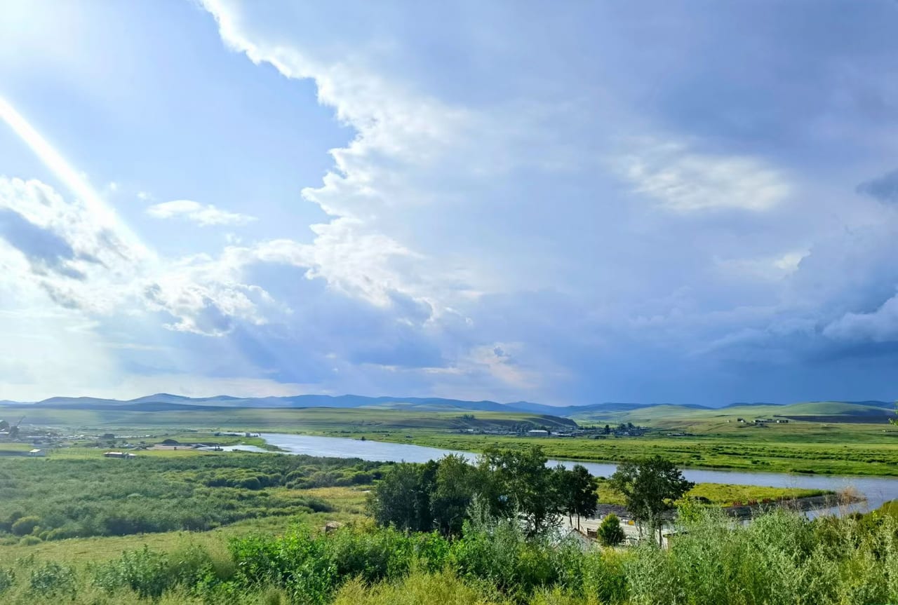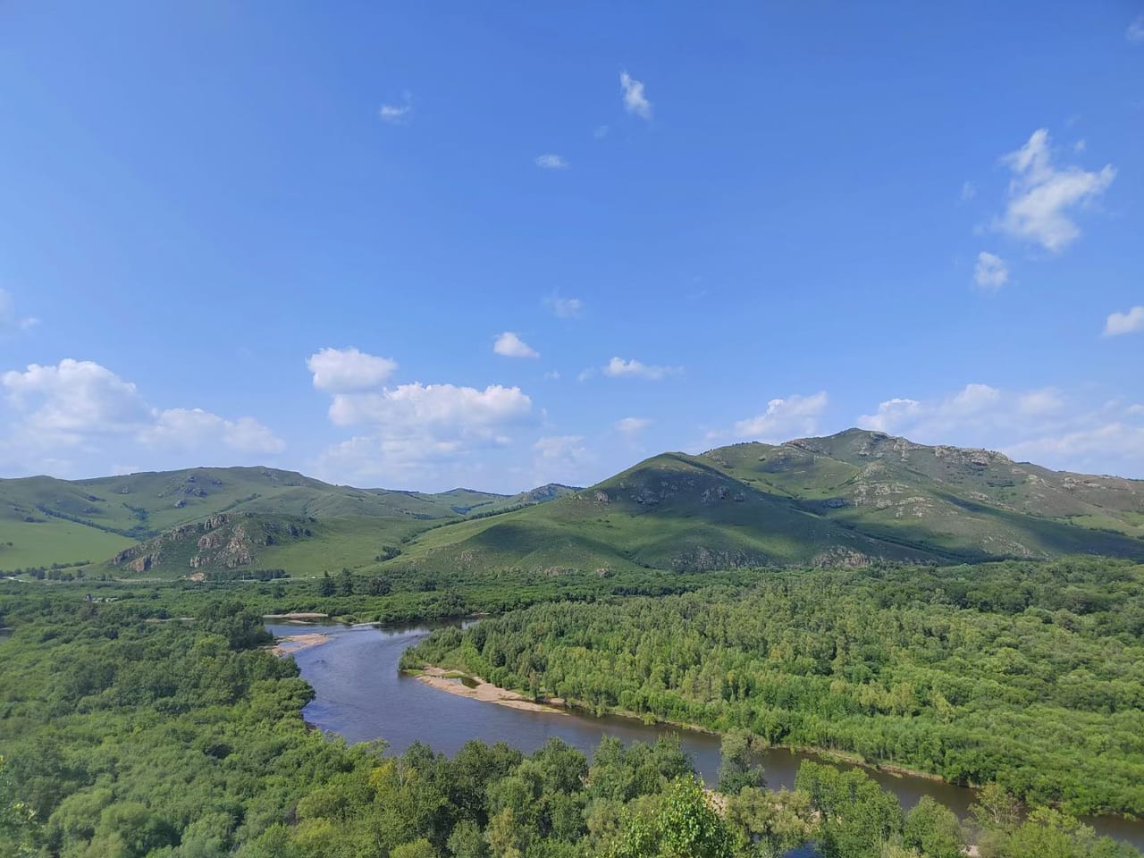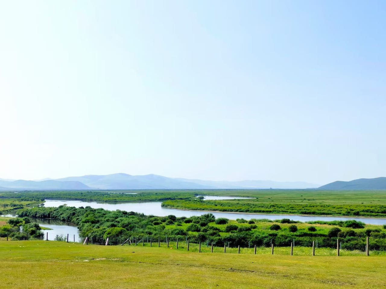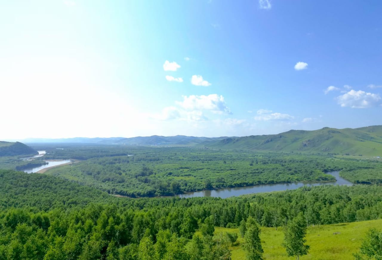 七卡去海拉尔的路上, 会经过额尔古纳国家湿地公园, 登到公园山顶瞭望, 延绵不绝的草原、 群山, 让人感叹祖国的壮美河山。