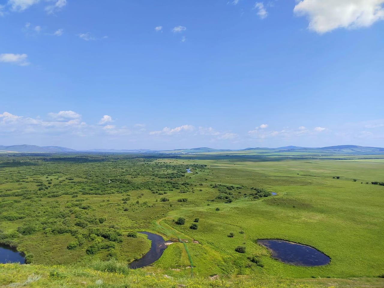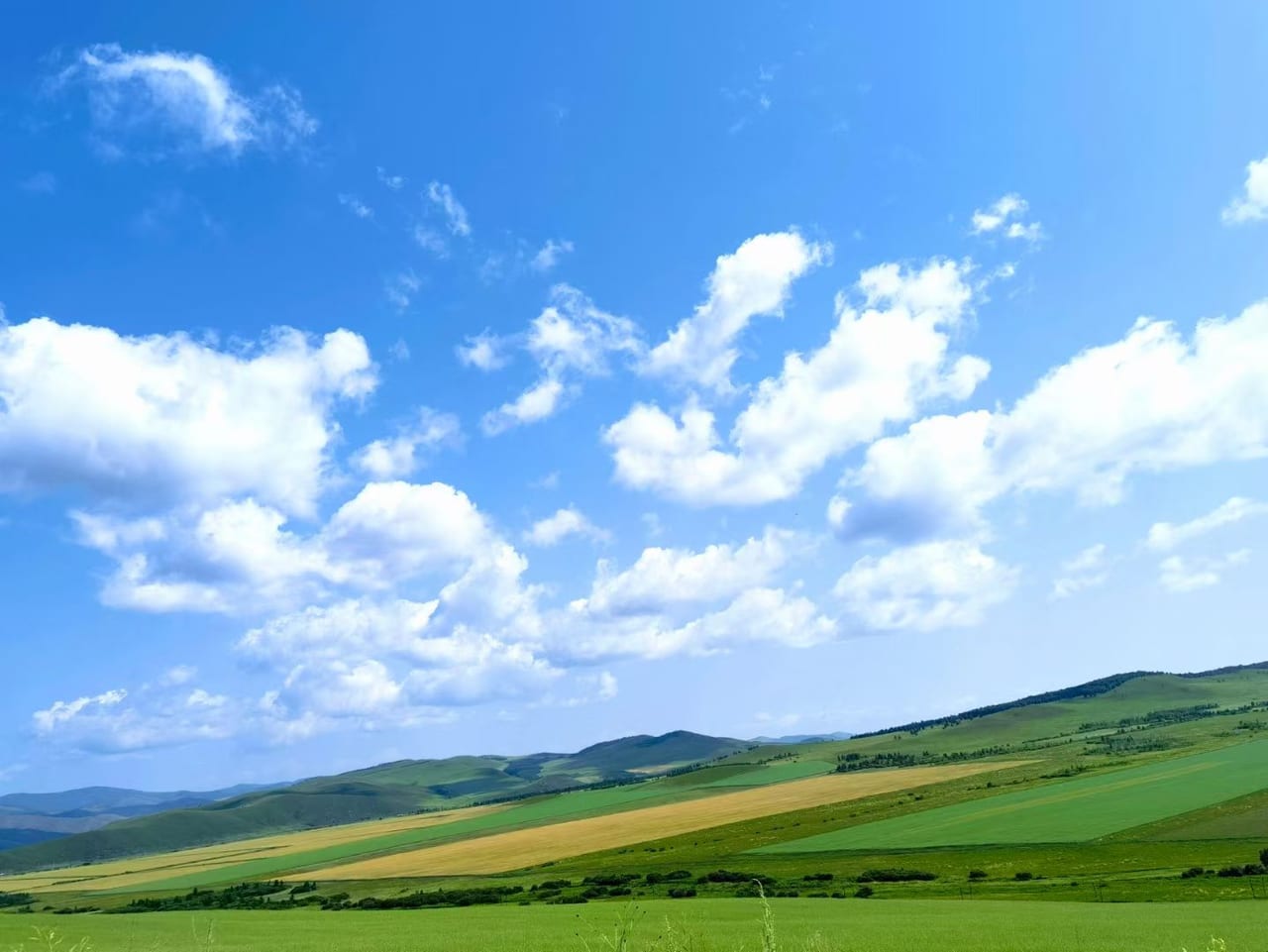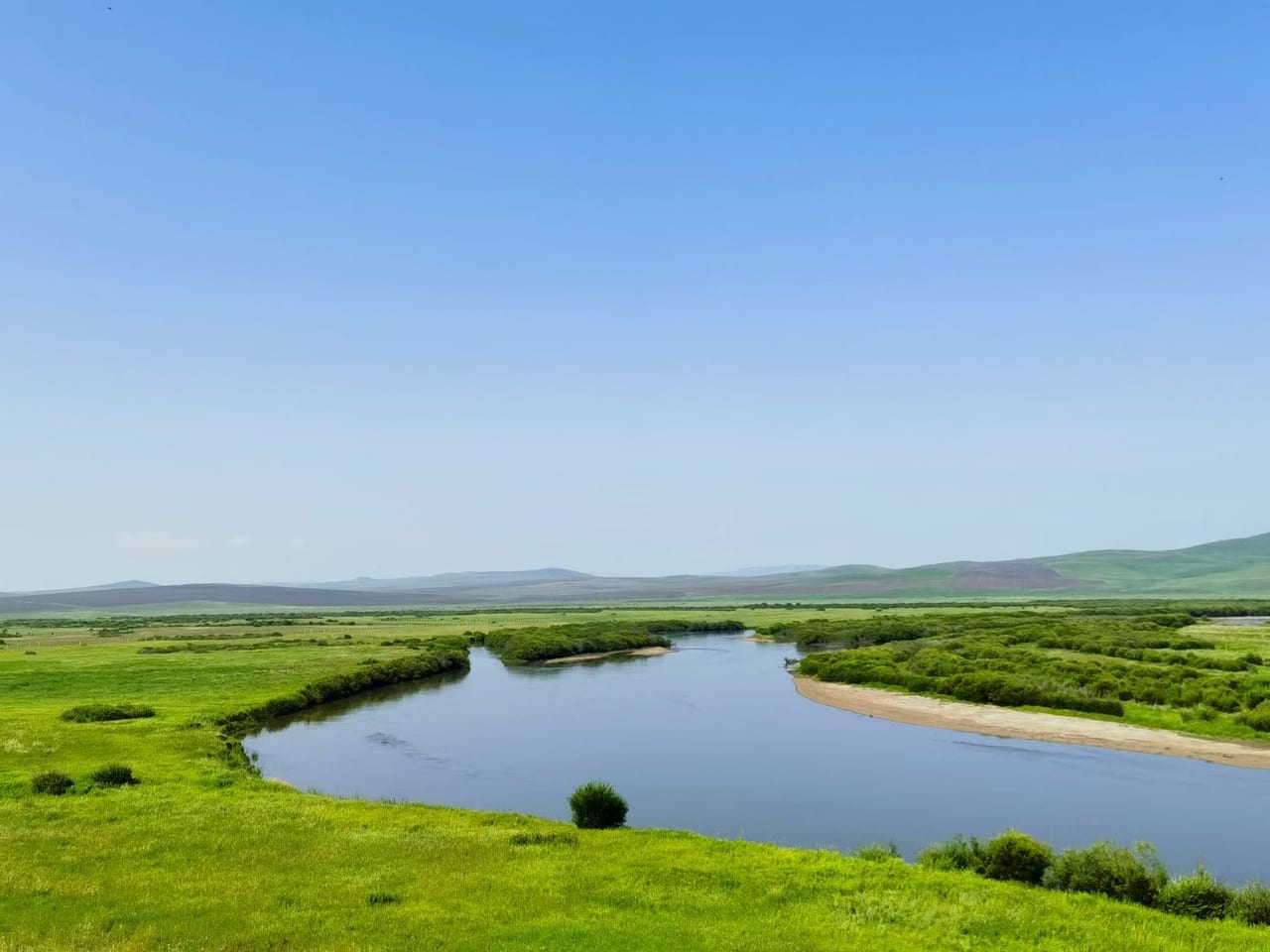 七卡去海拉尔的路上, 会经过额尔古纳国家湿地公园, 登到公园山顶瞭望, 延绵不绝的草原、 群山, 让人感叹祖国的壮美河山。