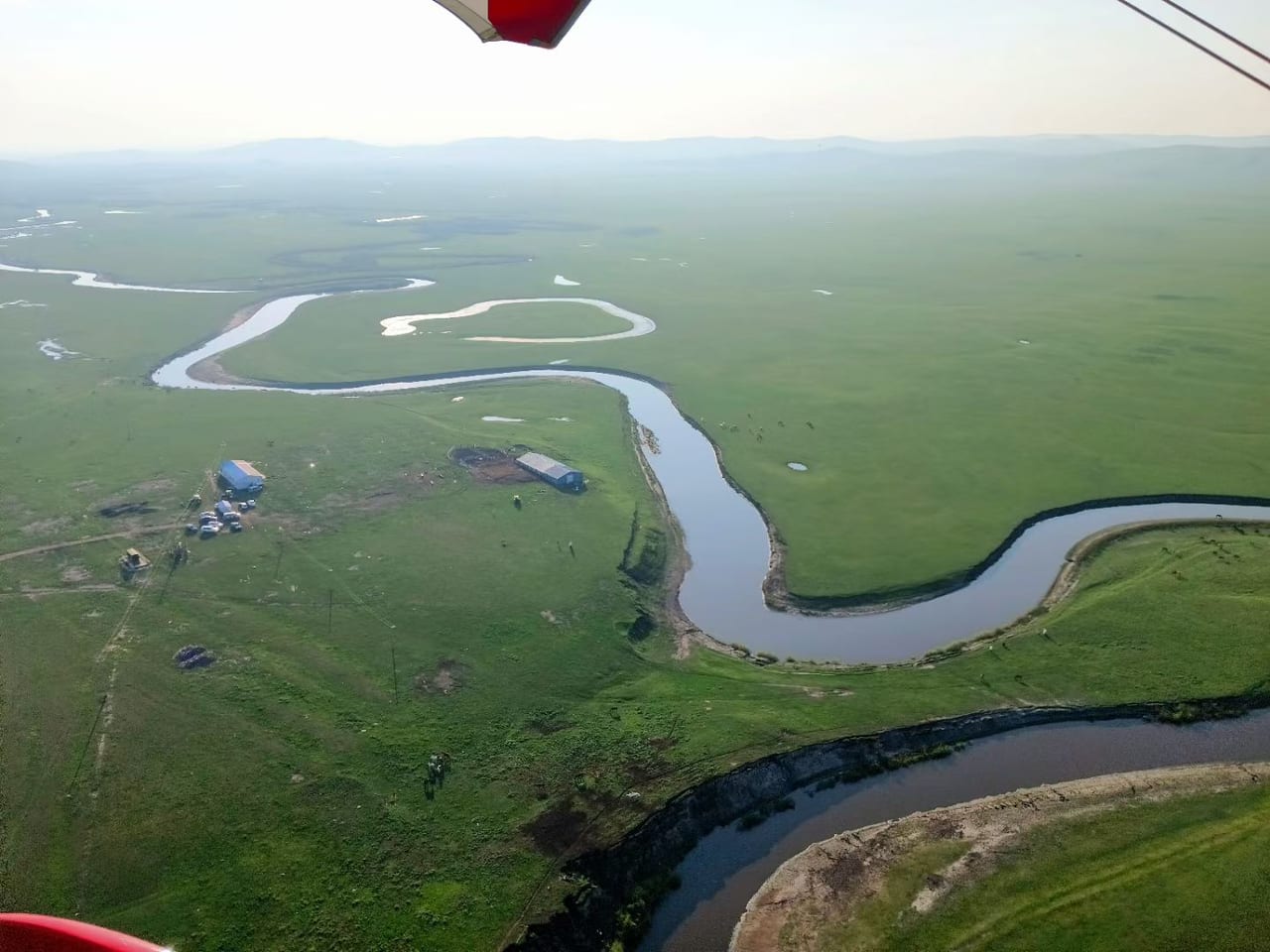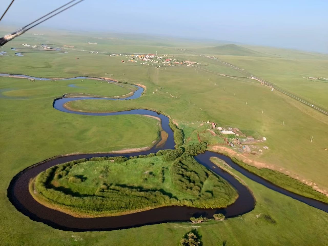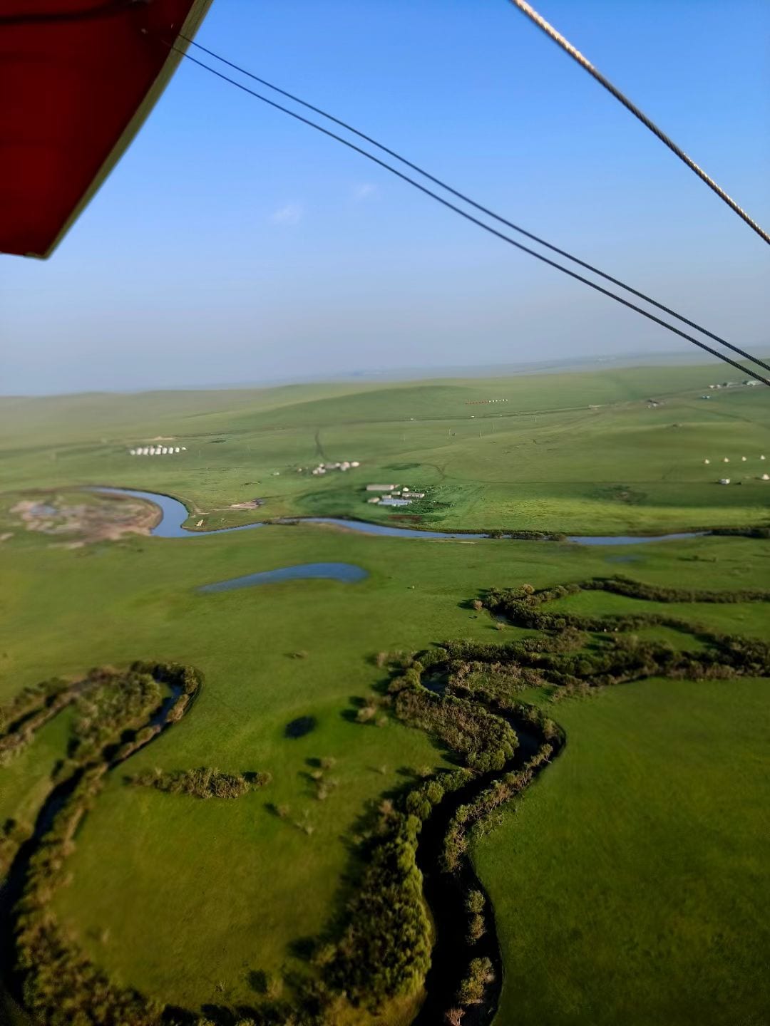 从额尔古纳国家湿地公园出来, 继续南下, 大约下午 5 点开到了莫尔格勒河 – 呼伦贝尔草原的母亲河, 因为官方观景台已经关闭, 所以一家人租了几架滑翔机, 从天空俯瞰莫尔格勒河。