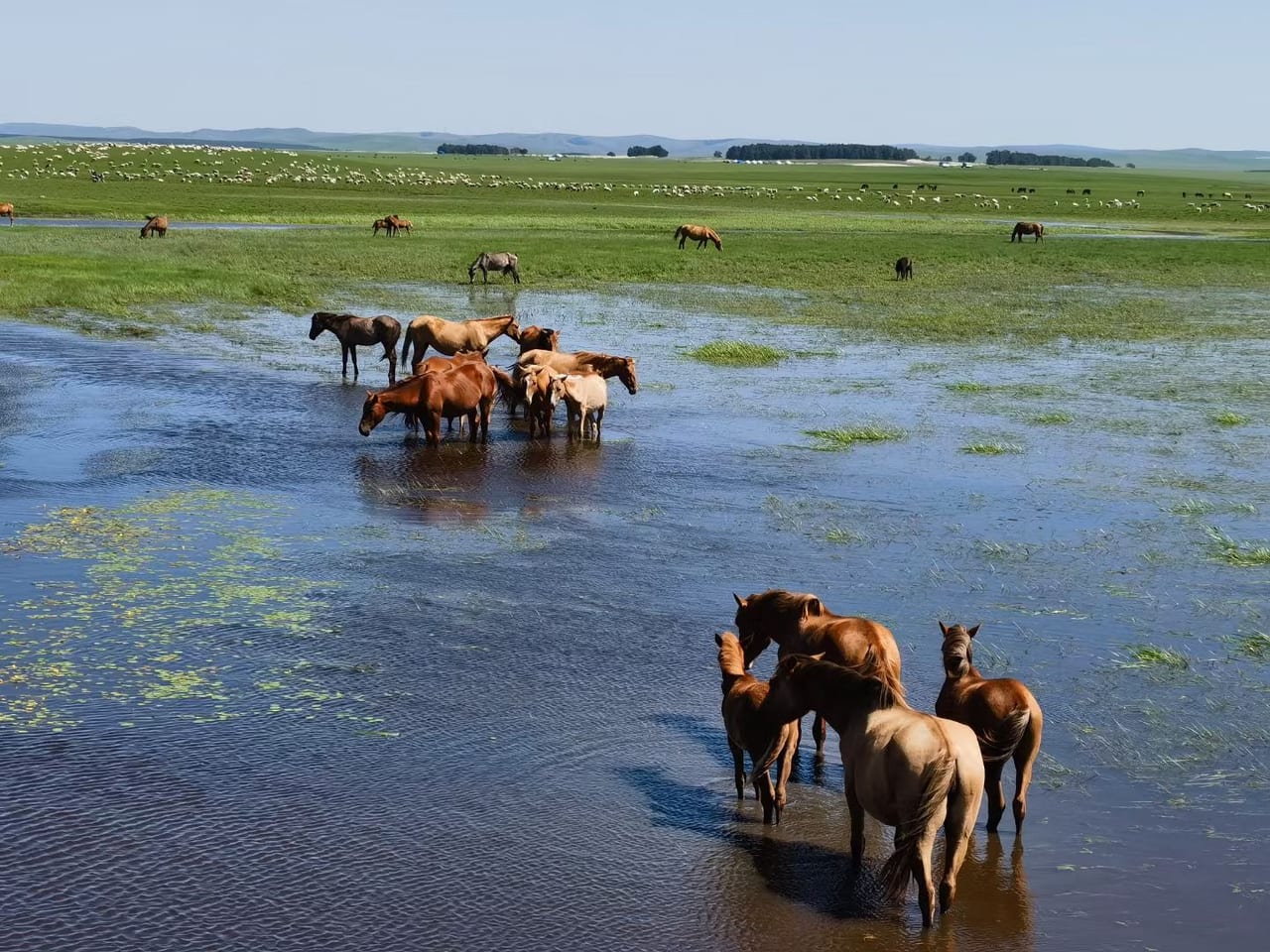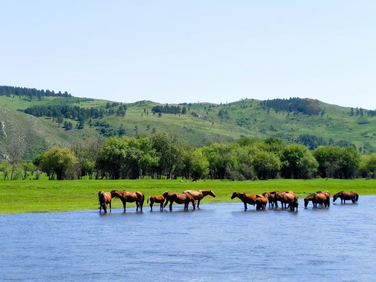 海拉尔继续南下去往阿尔山的路上, 看到了此次行程最美的马群, 两群马站在河水中, 相互向对方抬头喷水玩耍, 看着他们自由自在的生活, 感到非常的治愈, 看着它们的那一刻, 自己过去生活中遇到的所有困难都已烟消云散。