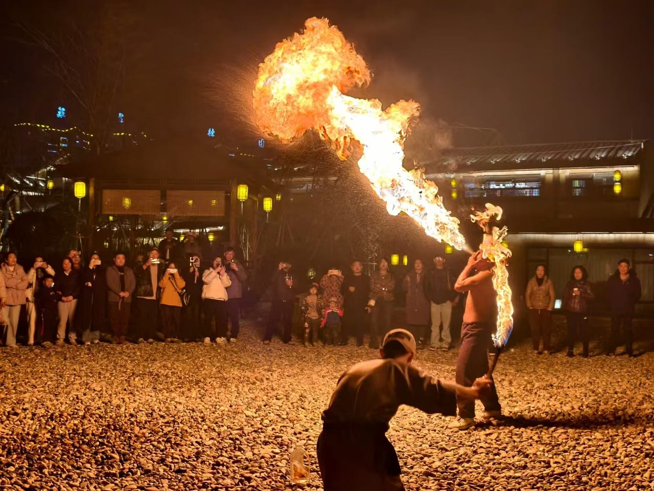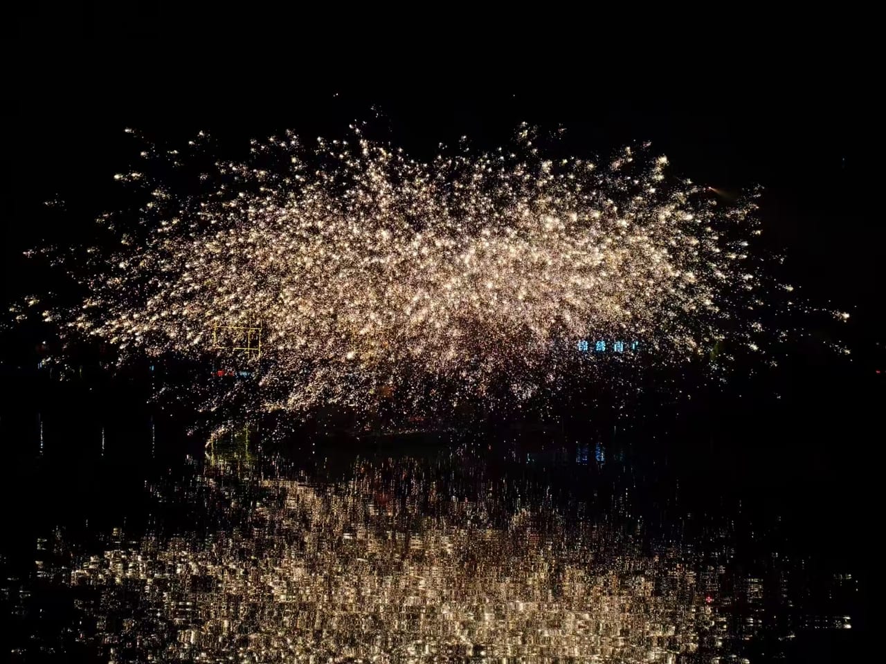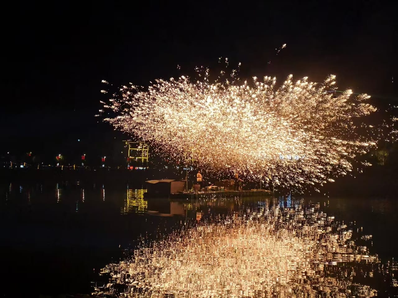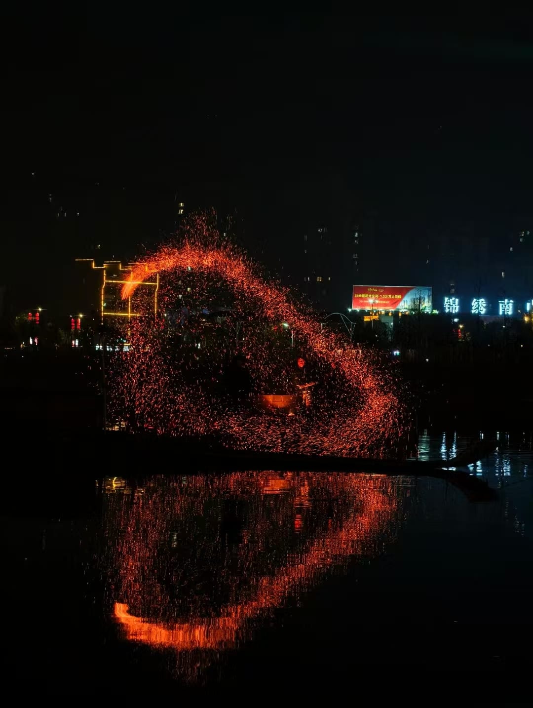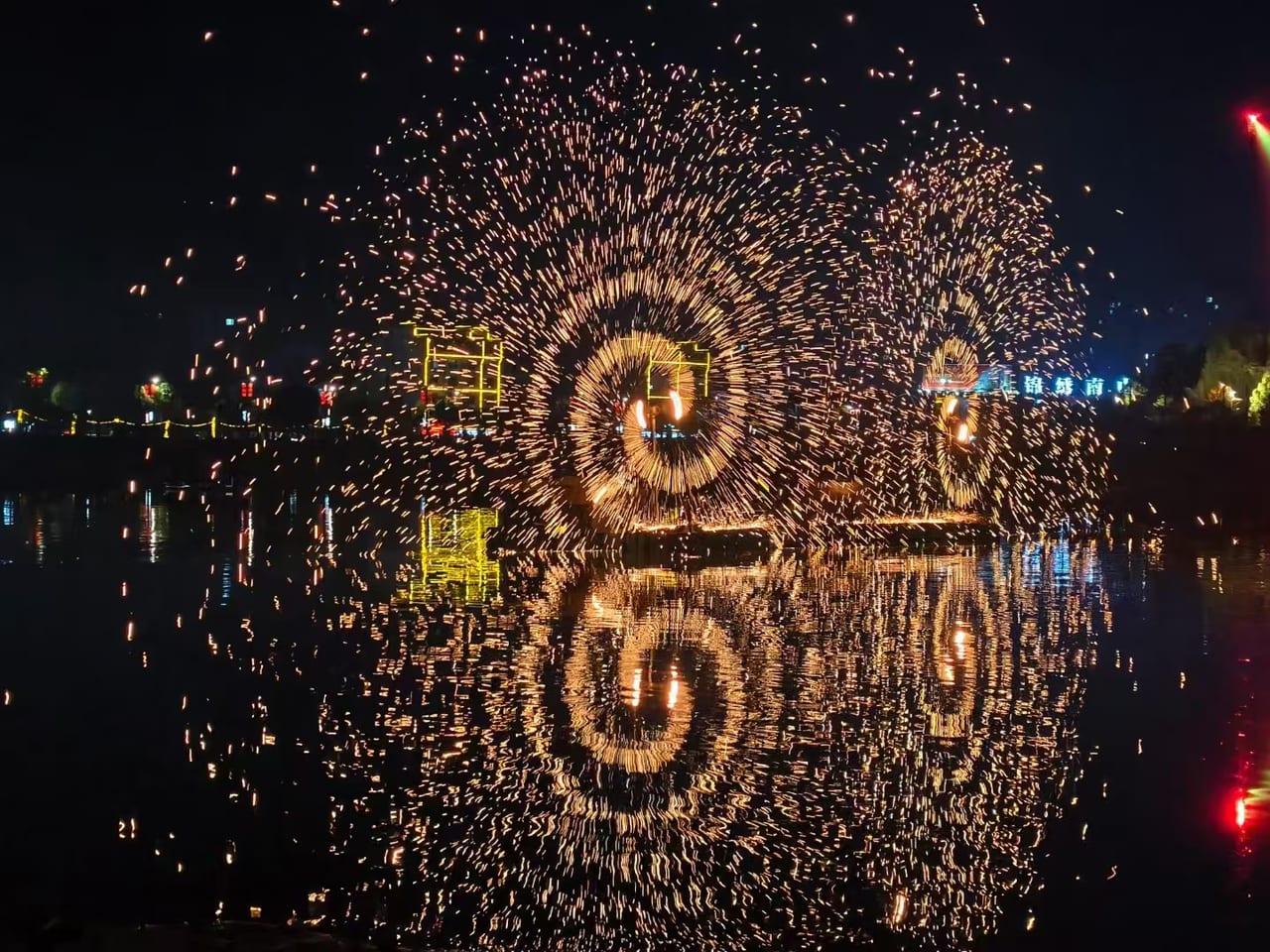 夜晚走在南岳里的石板路上, 灯火斑斓, 像一条金黄的星河悬在头顶, 河中央, 艺人挥洒的铁花在夜空绽放, 火树银花在河面上绽放, 好不热闹。