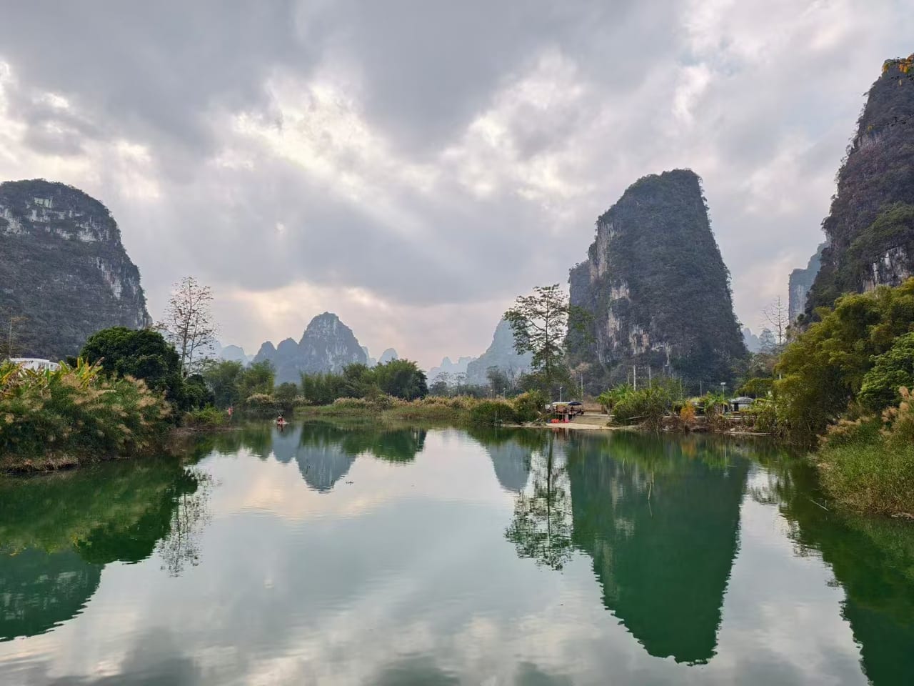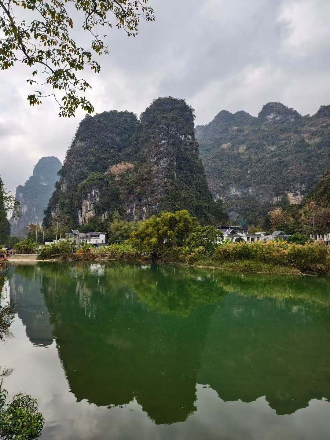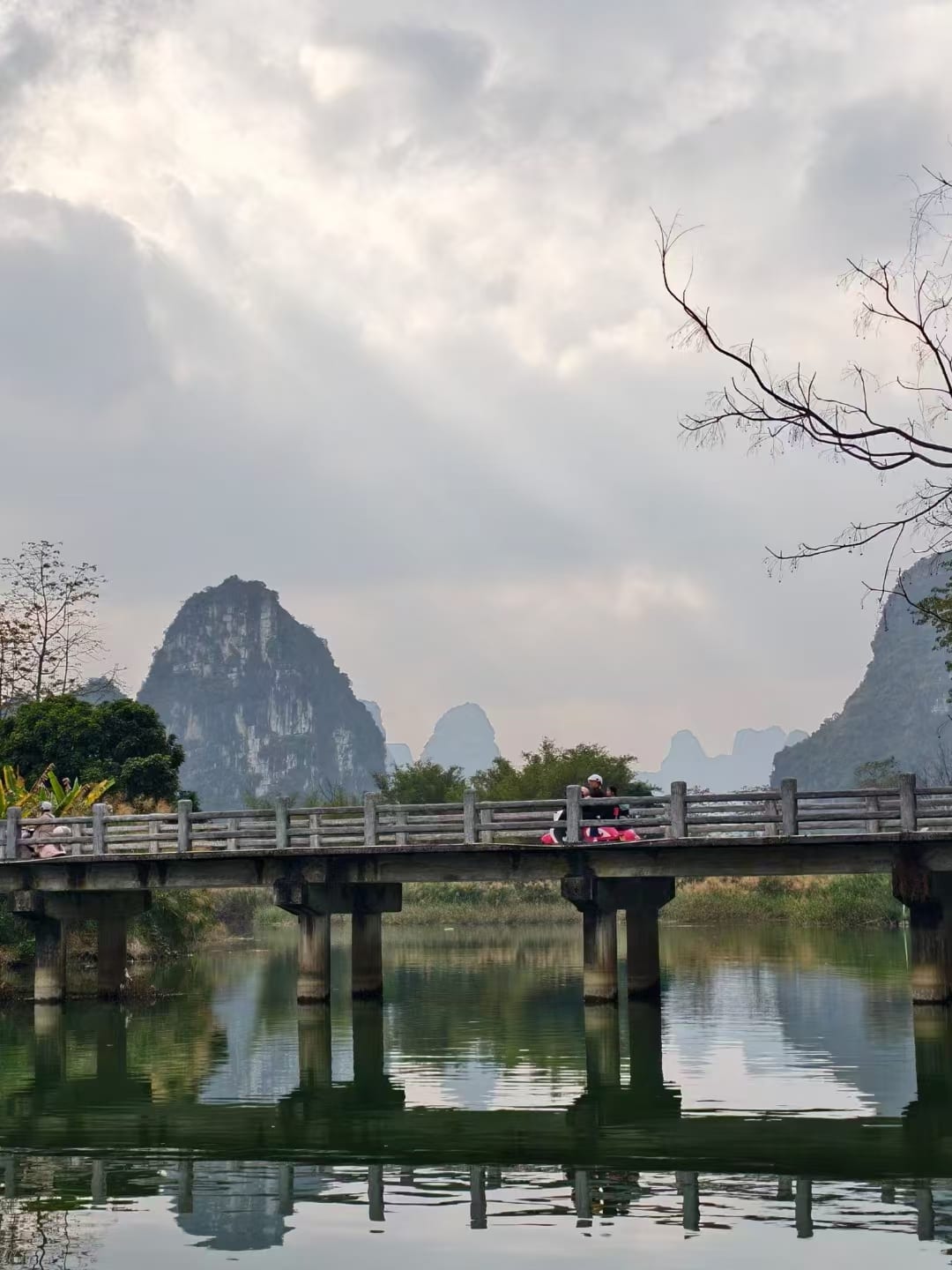 租一辆三轮车, 载着家人穿行在明仕田园的山水画卷中, 才明白为何古人总把江山比作泼墨。 坐在车上, 看着阳光穿透薄雾洒在喀斯特群峰上, 湖水倒映着天光云影, 一路走走停停, 竟不知不觉已在这幅天然水墨画中沉醉了整整一个下午。