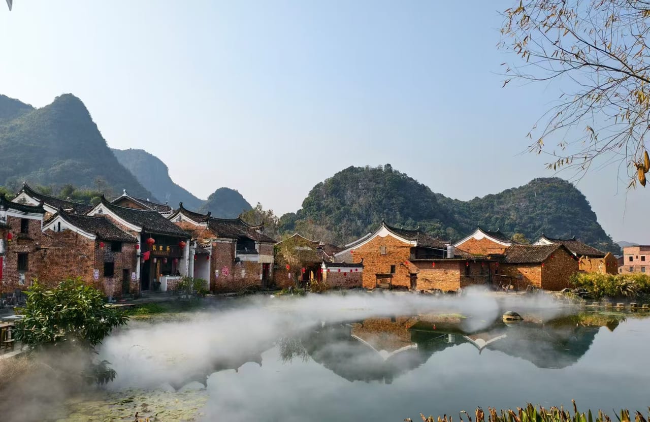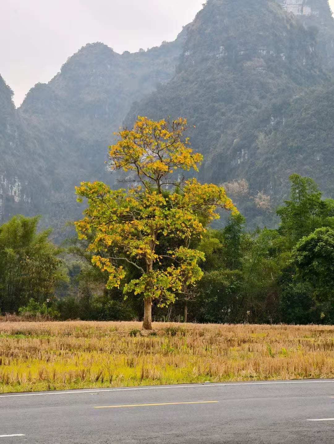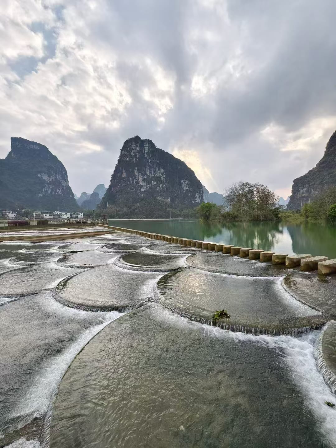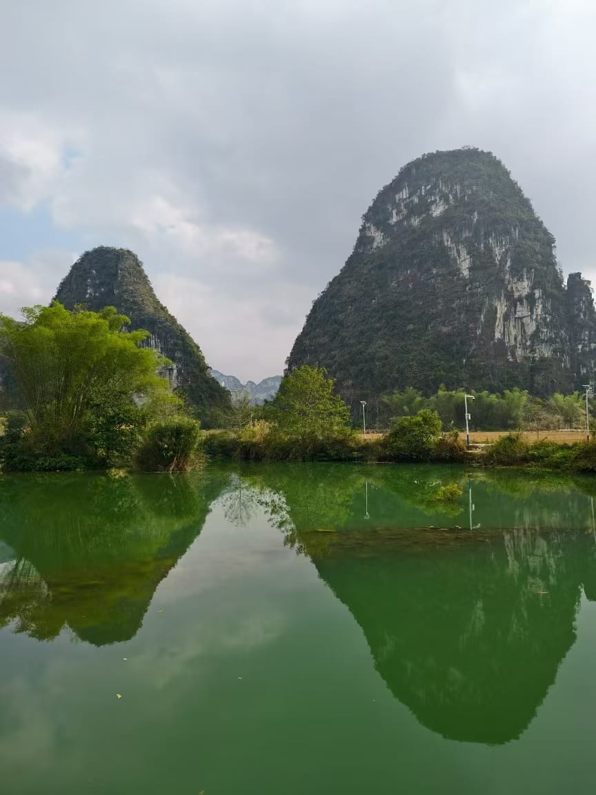 租一辆三轮车, 载着家人穿行在明仕田园的山水画卷中, 才明白为何古人总把江山比作泼墨。 坐在车上, 看着阳光穿透薄雾洒在喀斯特群峰上, 湖水倒映着天光云影, 一路走走停停, 竟不知不觉已在这幅天然水墨画中沉醉了整整一个下午。