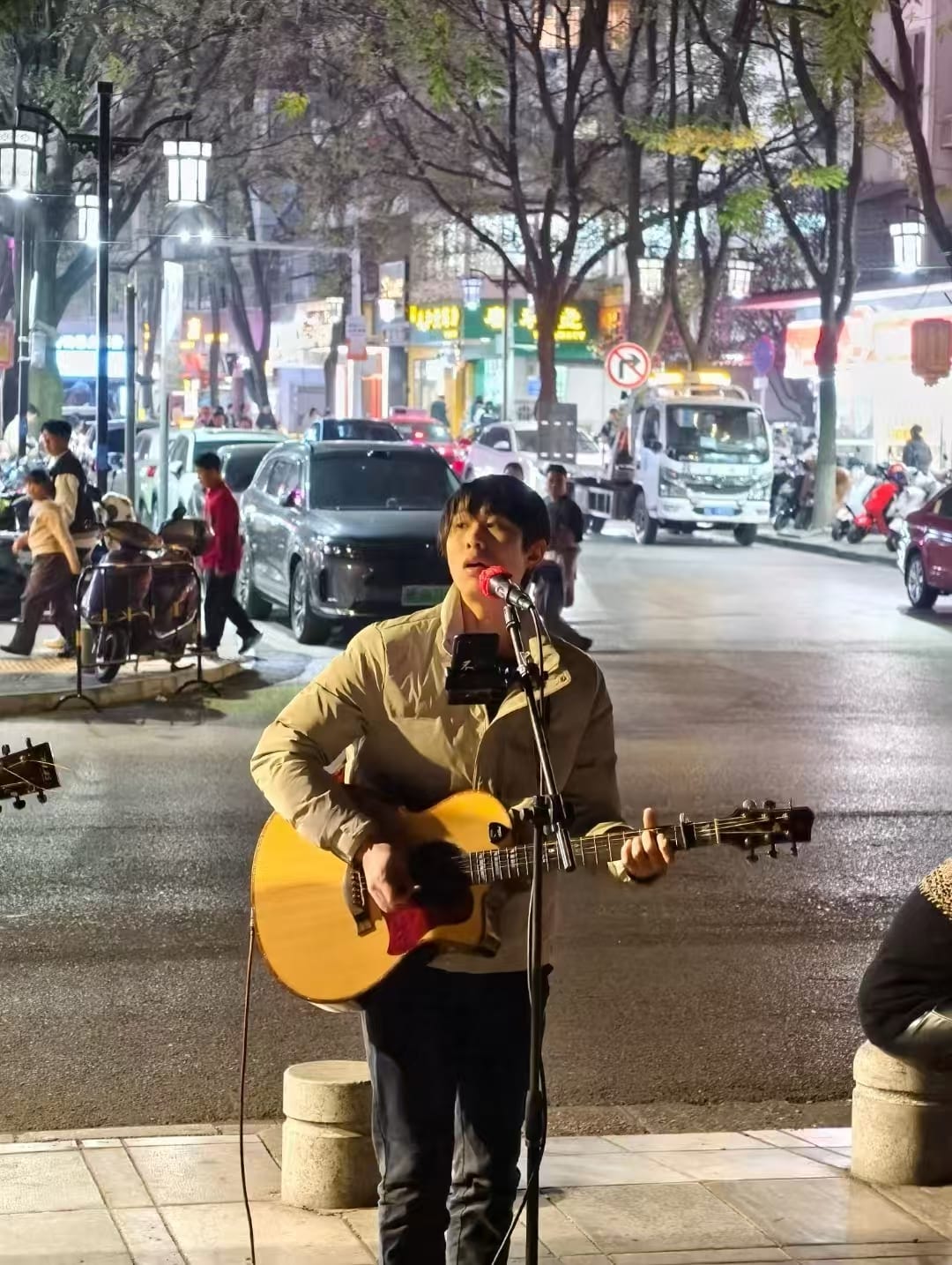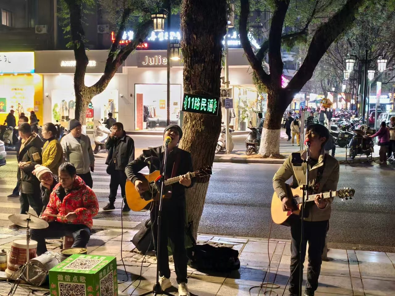 双塔旁的步行街, 寻着歌声找到了街边驻场的民谣乐队 “11 路民谣”, 点了我最喜欢歌手的歌。