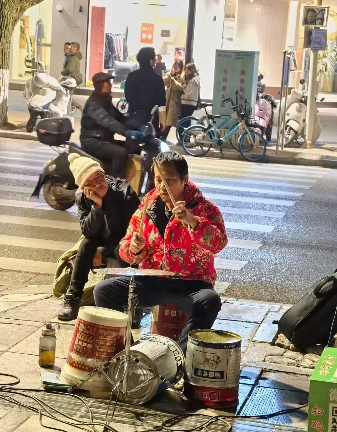 我最佩服的是架子哥, 东北花棉袄的行头, 无影旋转的鼓槌敲打着破旧铁桶, 一副不以为然的神态, 倒像个隐居闹市的江湖散人。 那随性的节奏里, 藏着他对生活的嘲弄, 也藏着对音乐最真挚的热爱。