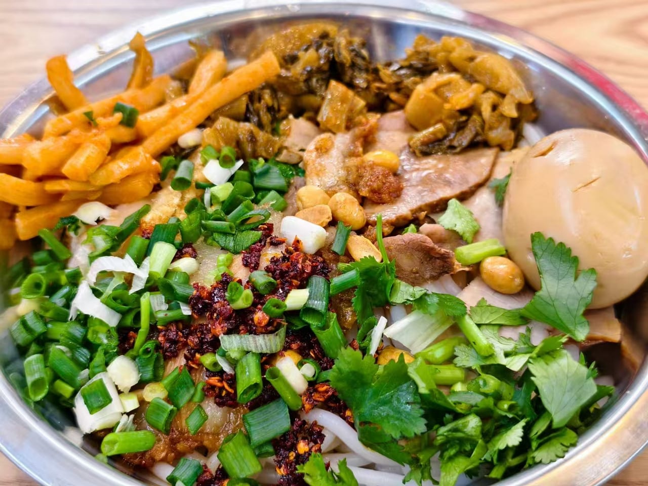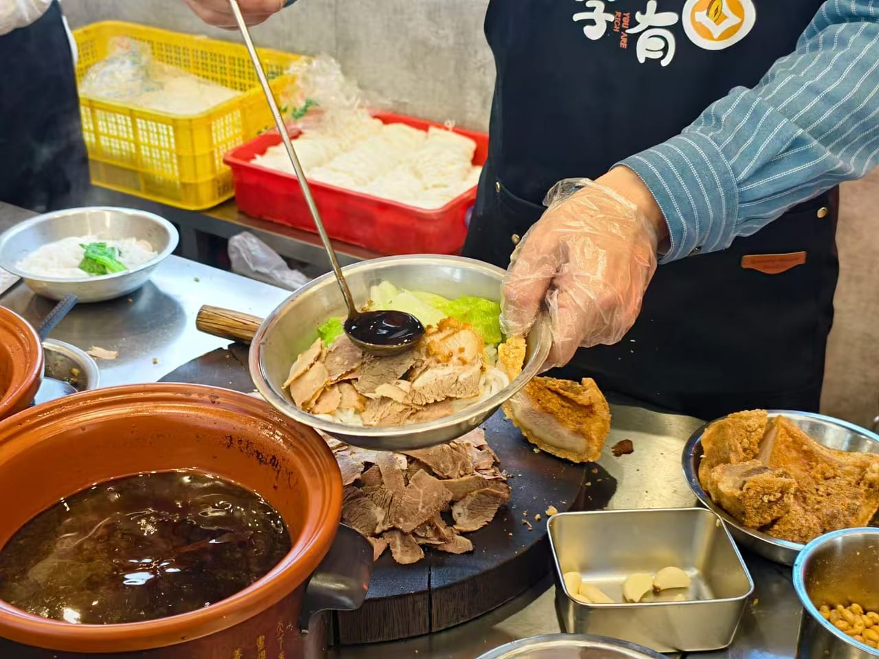 次日清晨, 找了桂林市区最正宗的桂林米粉, 老板熟练地舀起一勺浓汤淋在白肉肉片和脆皮五花上, 唆一口正宗的桂林米粉, 嗯, 那滋味, 有岁月的烟火, 也有凡人最简单的满足。