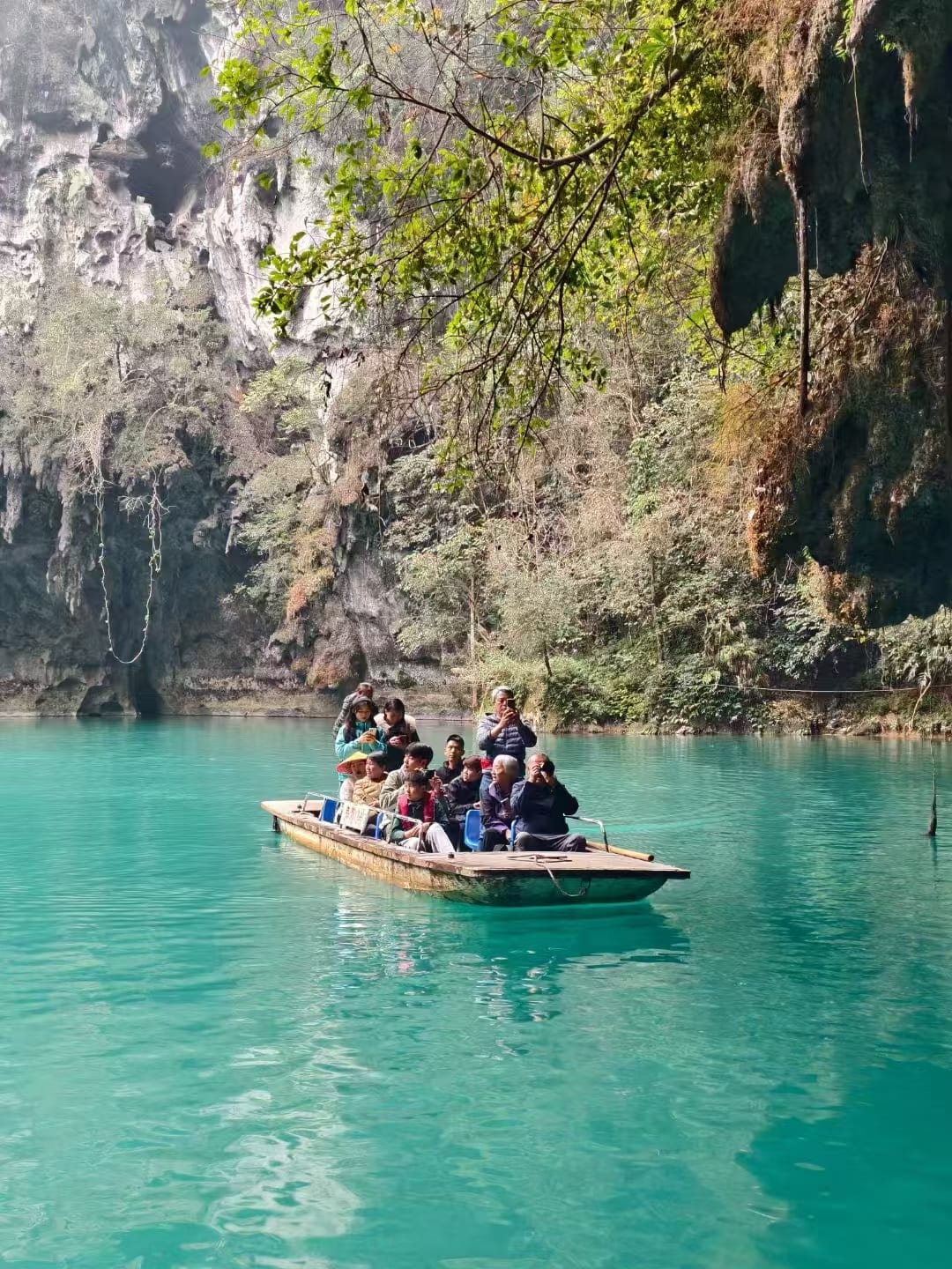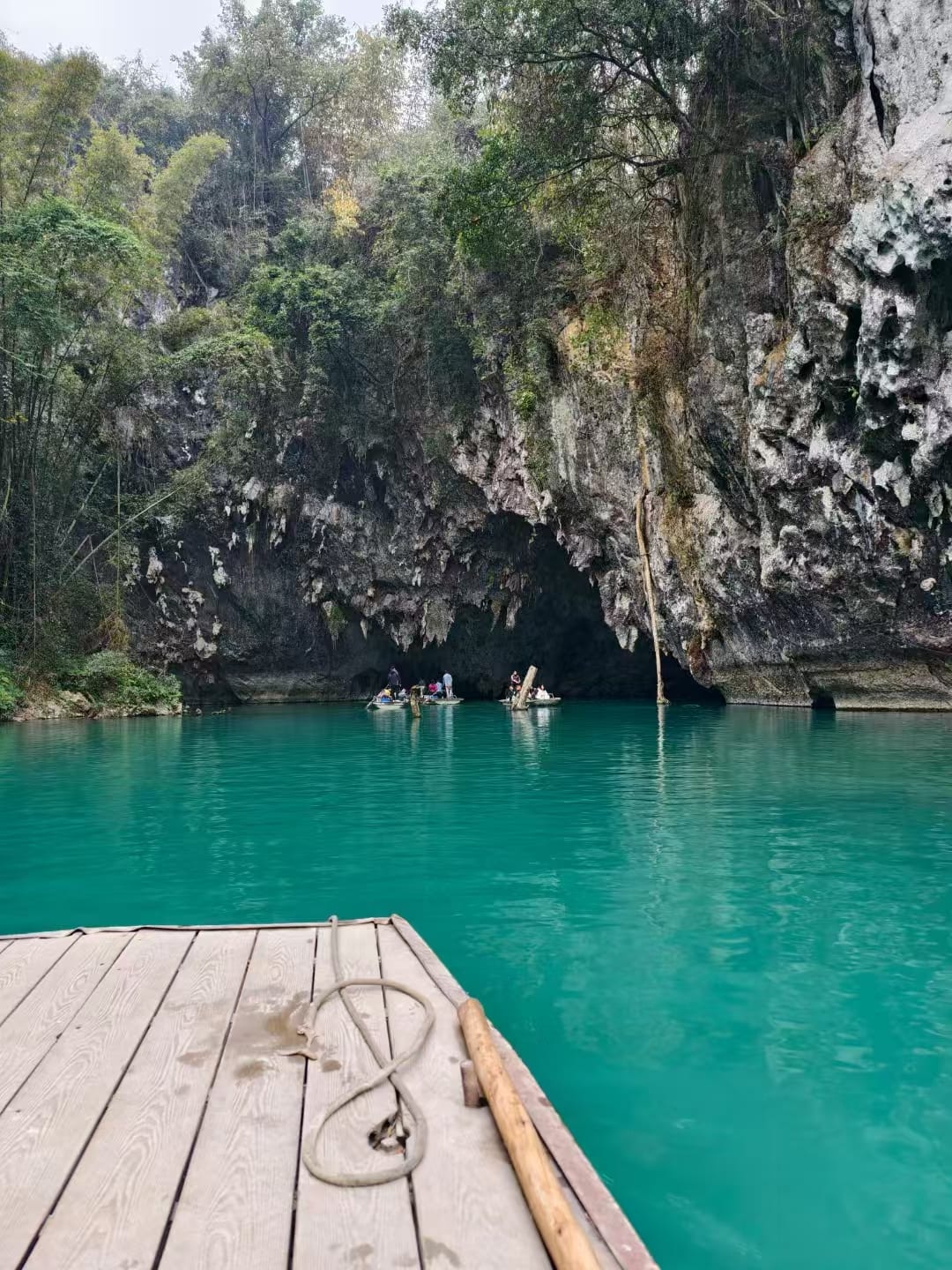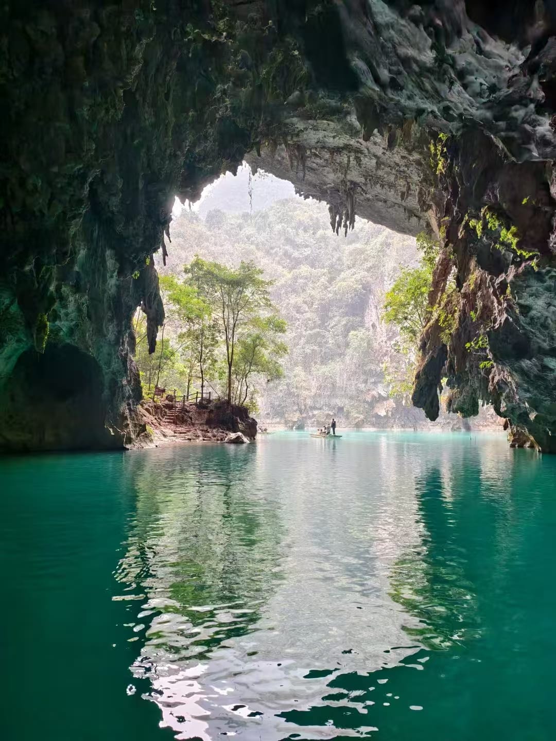 竹筏划过翡翠的湖面, 溶洞中钟乳石的倒影与水光交织, 仿佛进入了陶渊明笔下的那片绝世桃源。 山洞的穹顶沉淀了千年的时光, 而我们只是这时光长河中的一叶扁舟, 静静感受大自然鬼斧神工的鎏金刻画。