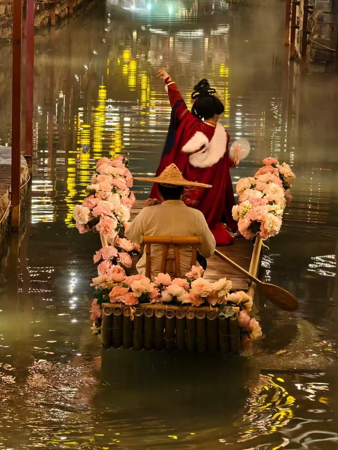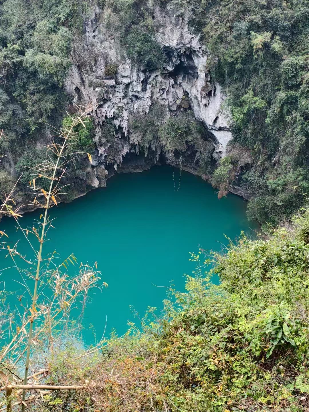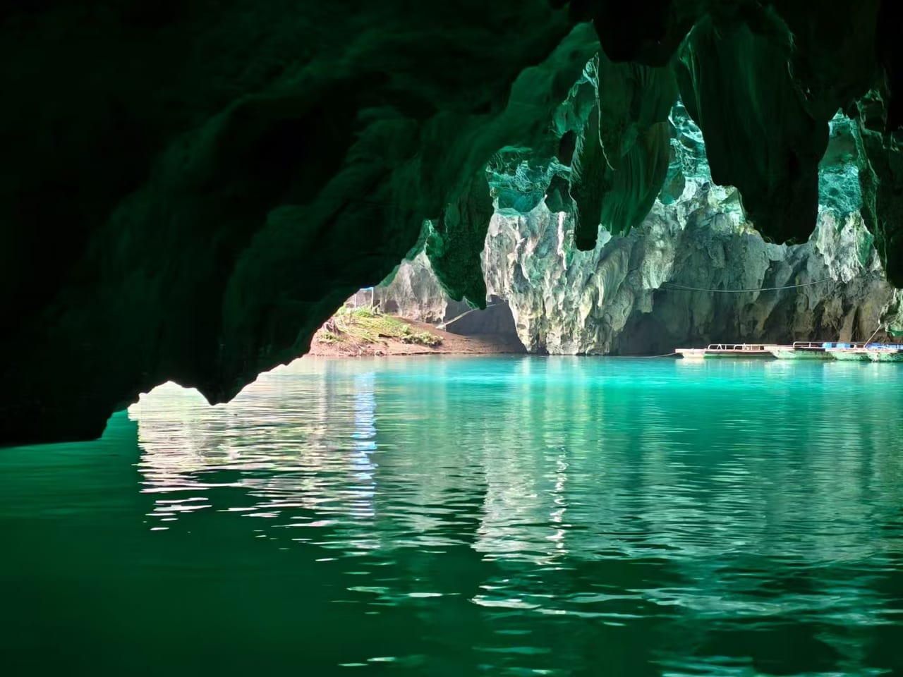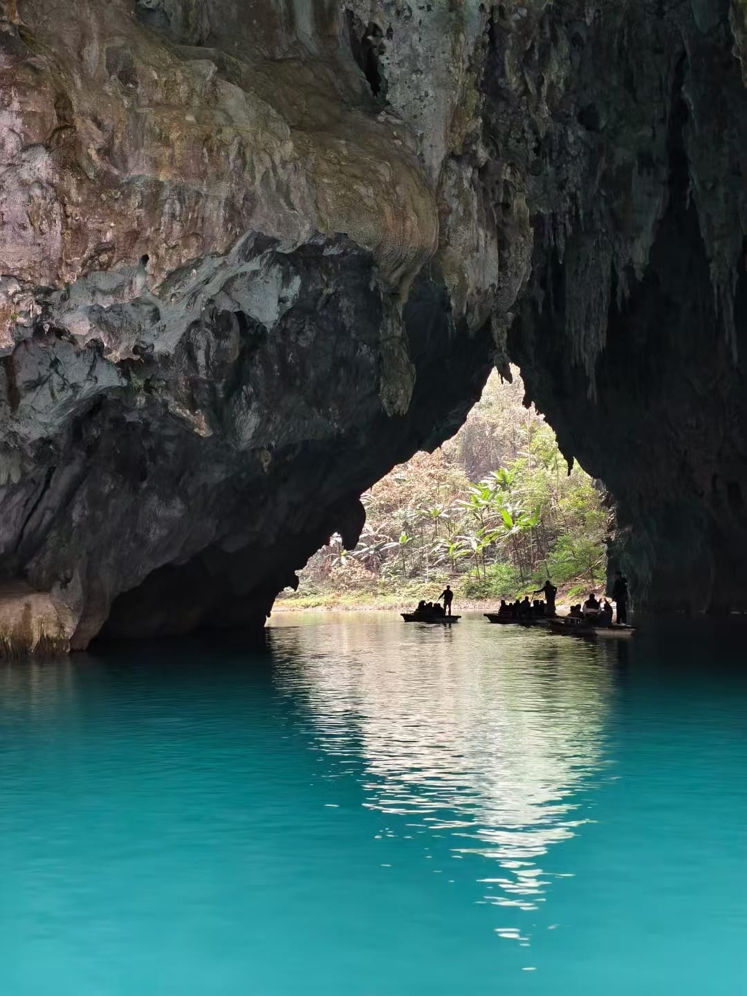 竹筏划过翡翠的湖面, 溶洞中钟乳石的倒影与水光交织, 仿佛进入了陶渊明笔下的那片绝世桃源。 山洞的穹顶沉淀了千年的时光, 而我们只是这时光长河中的一叶扁舟, 静静感受大自然鬼斧神工的鎏金刻画。