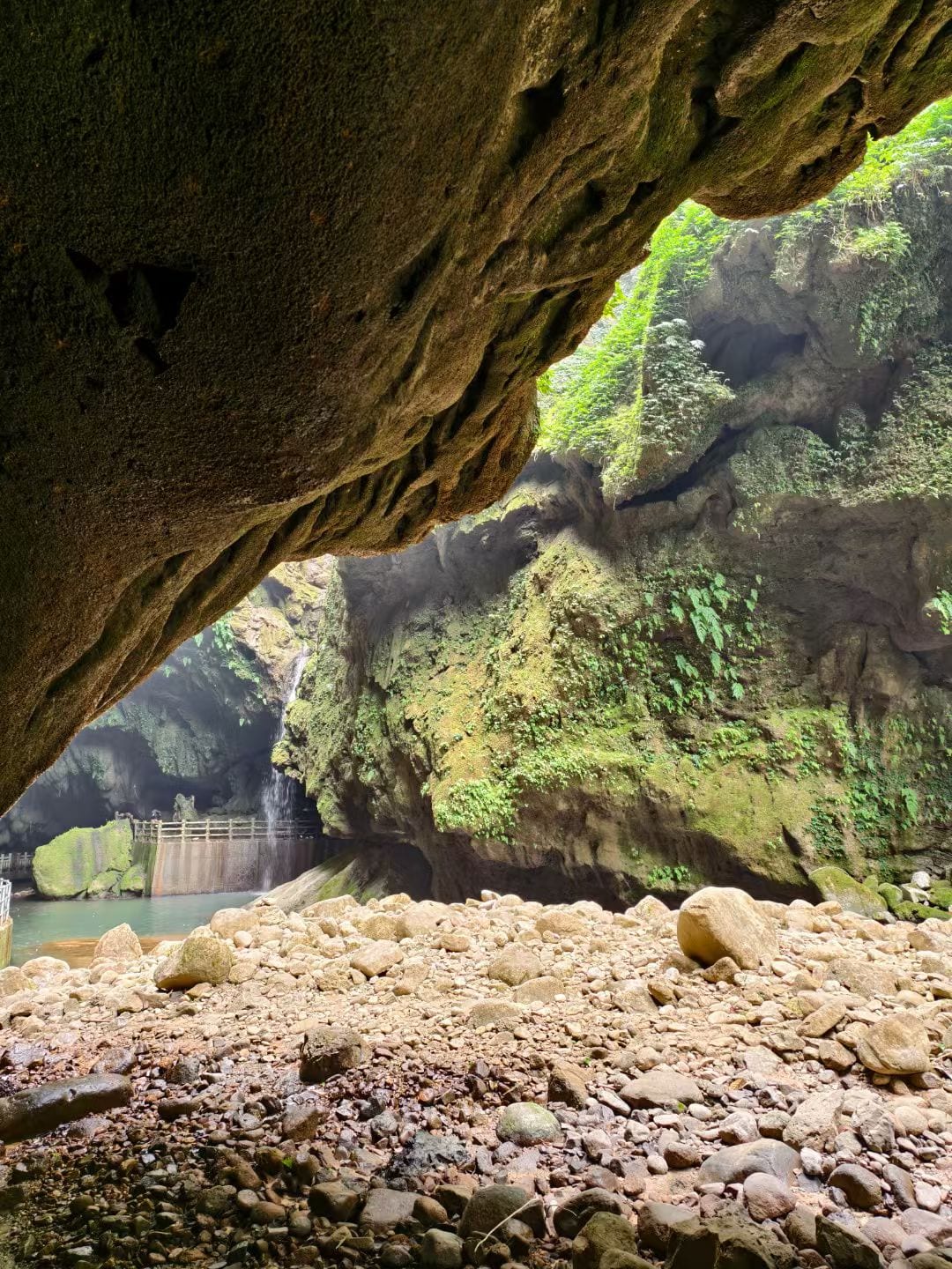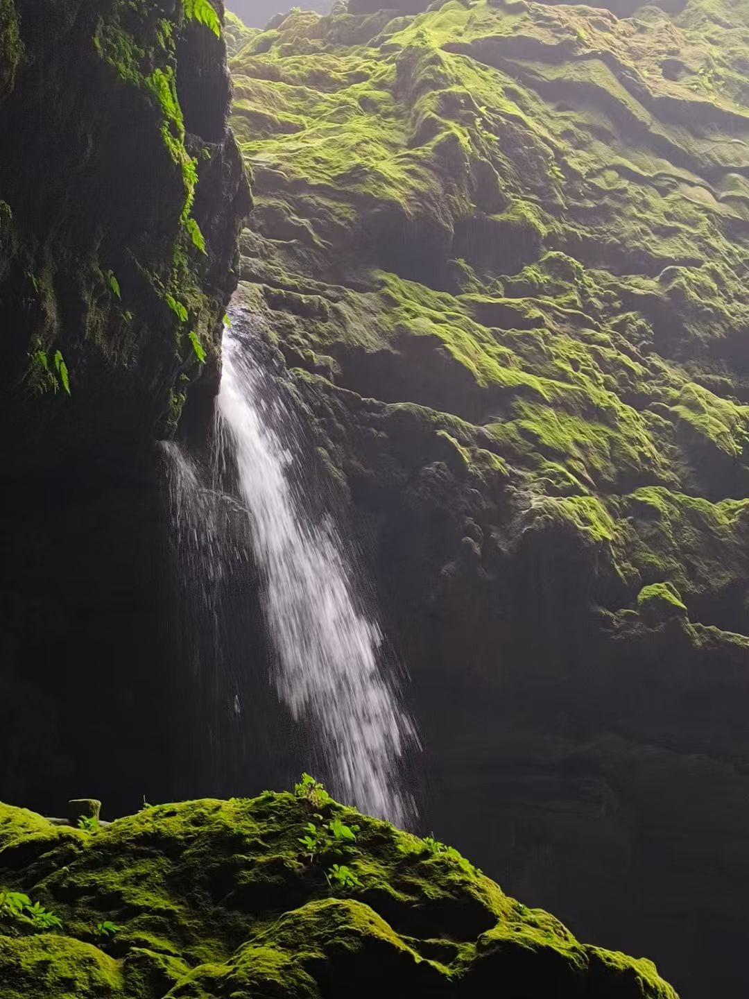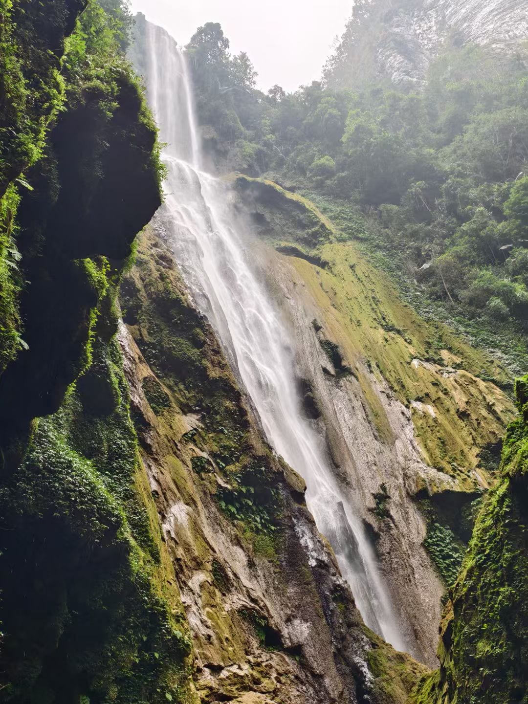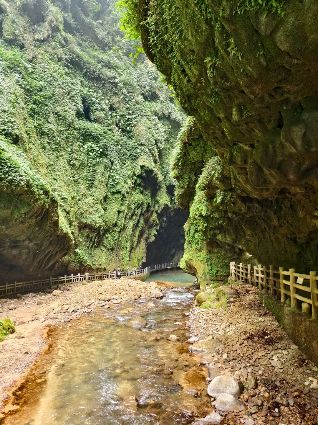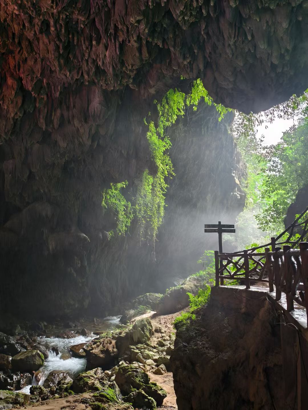 瀑布从天际倾泻而下, 水雾弥漫中, 栈道蜿蜒穿行在幽深的峡谷间, 仿佛步入了世外秘境。 阳光透过洞顶的缝隙洒落, 与流水的潺潺声相和, 将这一方天地渲染得如此空灵, 让人不由得放慢脚步, 去聆听大自然最原始的呼吸。