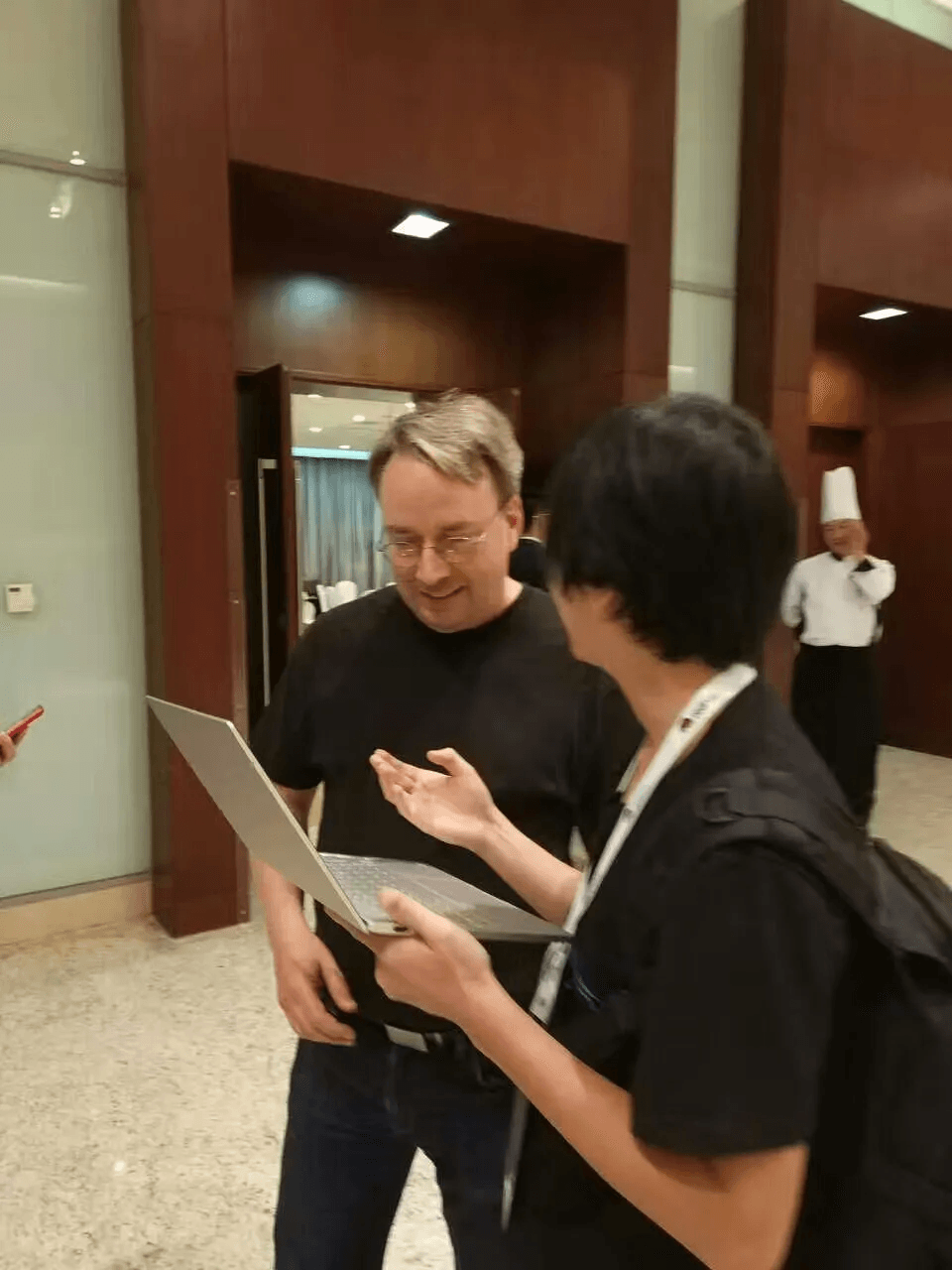 我第一次见 Linus 是在 2016 年,一堆人在开源大会没追上祖师爷,我去了后厨餐厅,独自近距离接触大神。我那时候在创建 Deepin Linux,用了小米笔记本搭配最新的内核,然后定制了 Linus 的壁纸,送给祖师爷。Linus 看到自己的壁纸在自己的内核上跑的时候,都害羞的捂脸了。我不管他在邮件列表中怎么爆粗口,我近距离接触到的 Linus 是那么有剑气的实力,但是一点都不装,非常平易近人,虽然我那时的英语太渣(现在也是),但是我也鼓起我 10000% 的勇气,用美剧学来的英语,结结巴巴地给祖师爷说了: I … hope…hope…hope you like it.