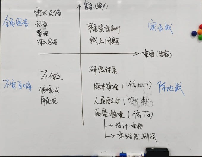 重要不紧急的,一般都是研发大任务,但是很多研发转岗的人并不懂得这种阵地战的打法,关键是三个:版本管理的关键是,定好里程碑,大家完成一个版本就上线,这样对团队士气有帮助,而不是所有版本功能都杂在一起做,完成进度的时间长了,团队就疲惫了,做啥都没劲;人员配合的目的是了解每个人的特长,发挥长处,规避短处,人员配合好,就有奇兵优势;质量检查主要分为高强度测试和定期嗅探代码臭味道,代码太臭了就要给同事重构的时间,这样代码结构强大才能带来产品质量稳定,稳定就可以获得客户的夸奖,对团队也是一种荣誉和士气提升