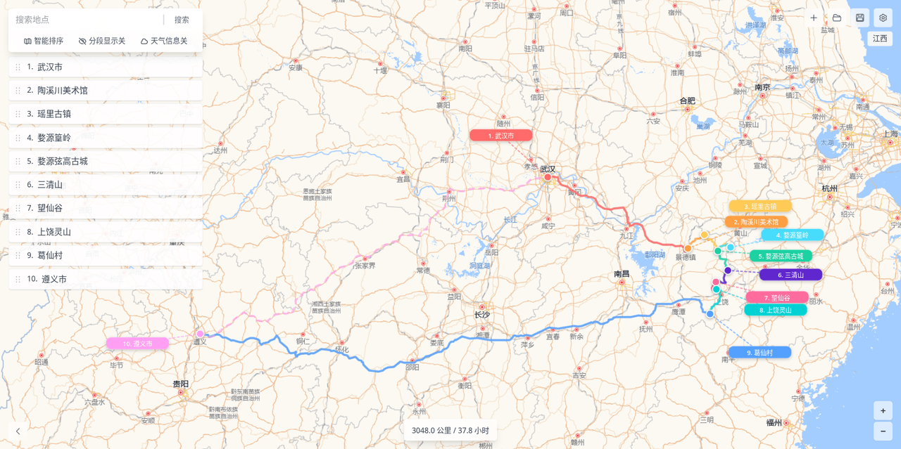 今年春节主要玩一下武汉周边的江西,整个行程一周时间,自驾非常的轻松,下面是懒猫旅游地图规划的自驾路线